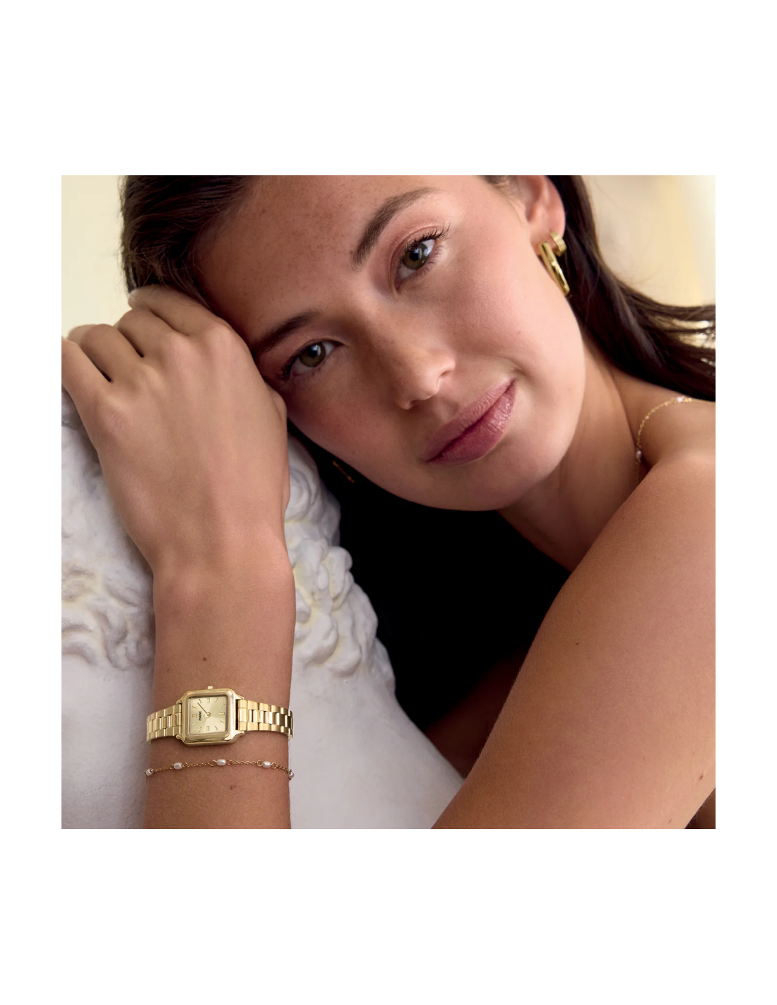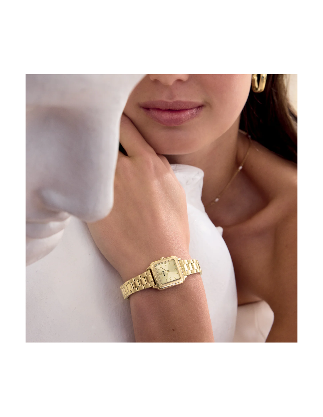 El reloj cuadrado Gracieuse Mini para mujer cuenta con una caja y esfera de color dorado de 21 mm y una correa de acero inoxidable de 12 mm.