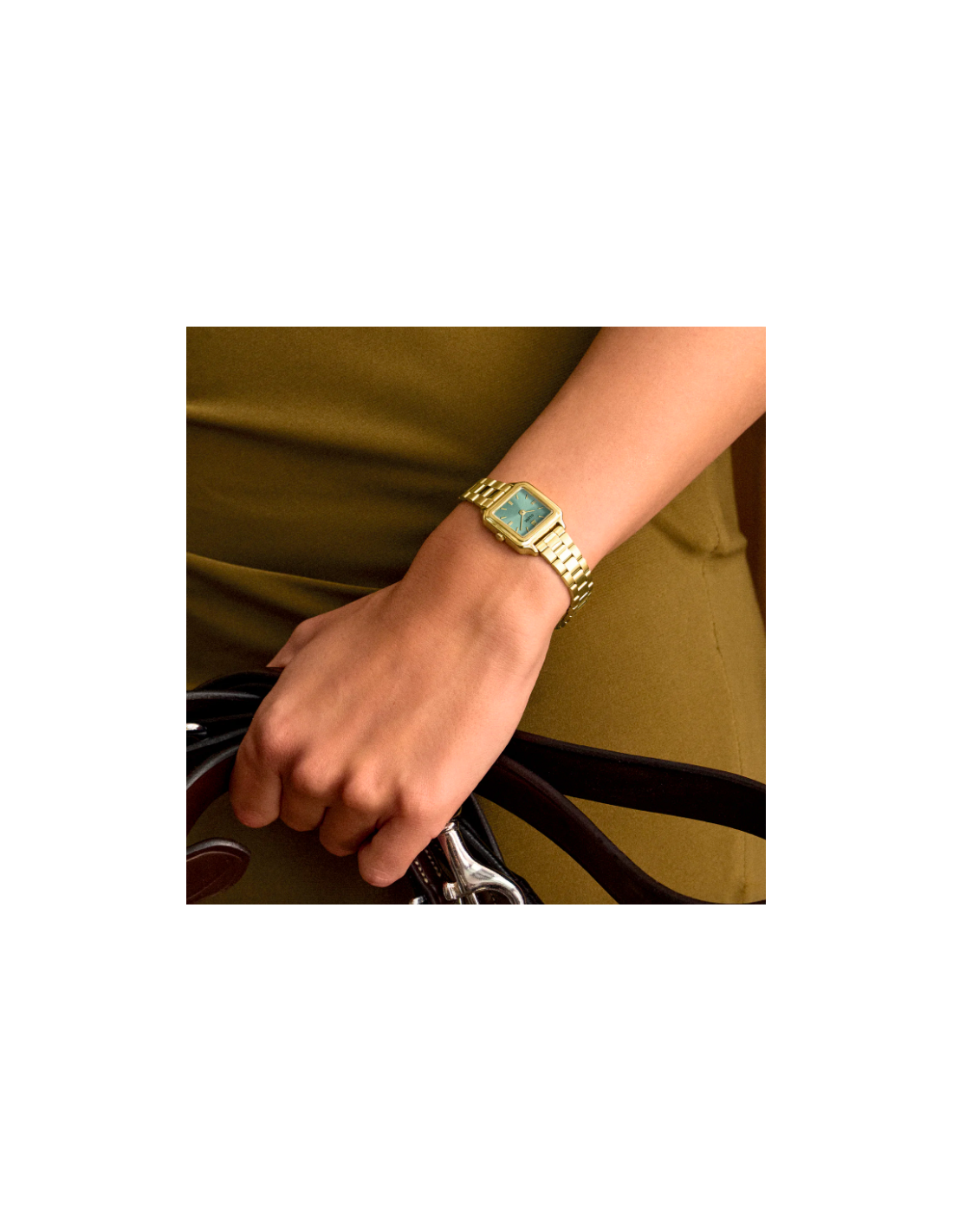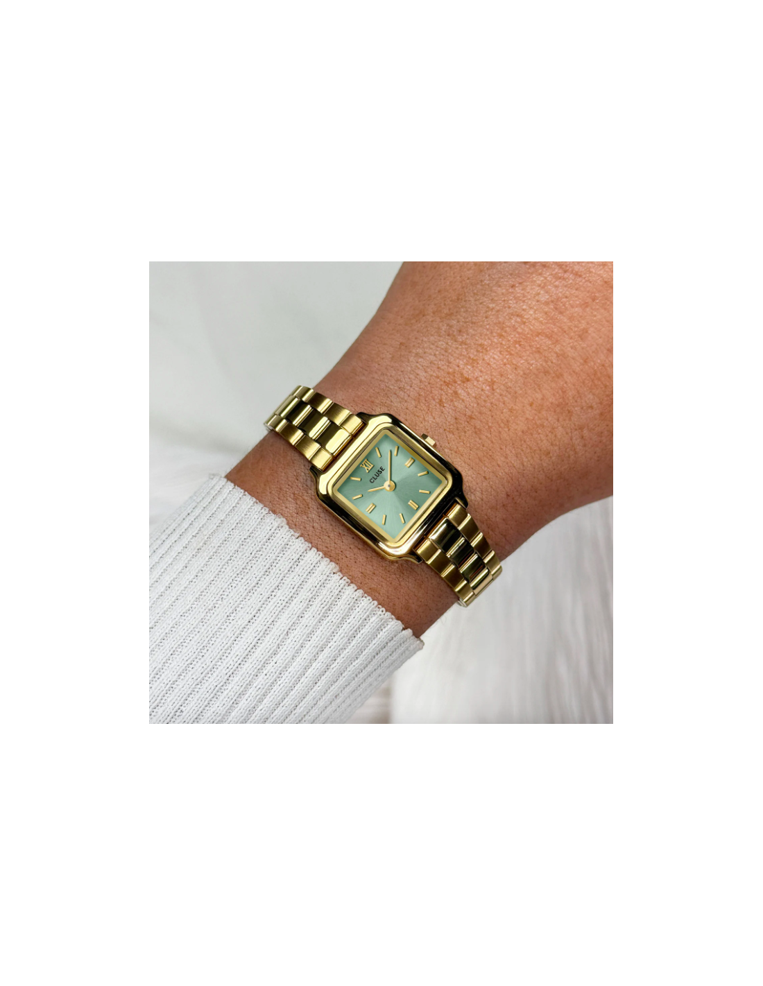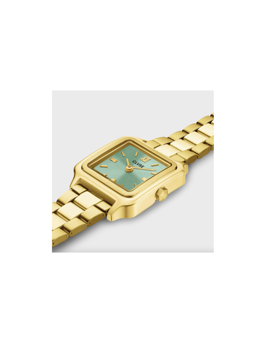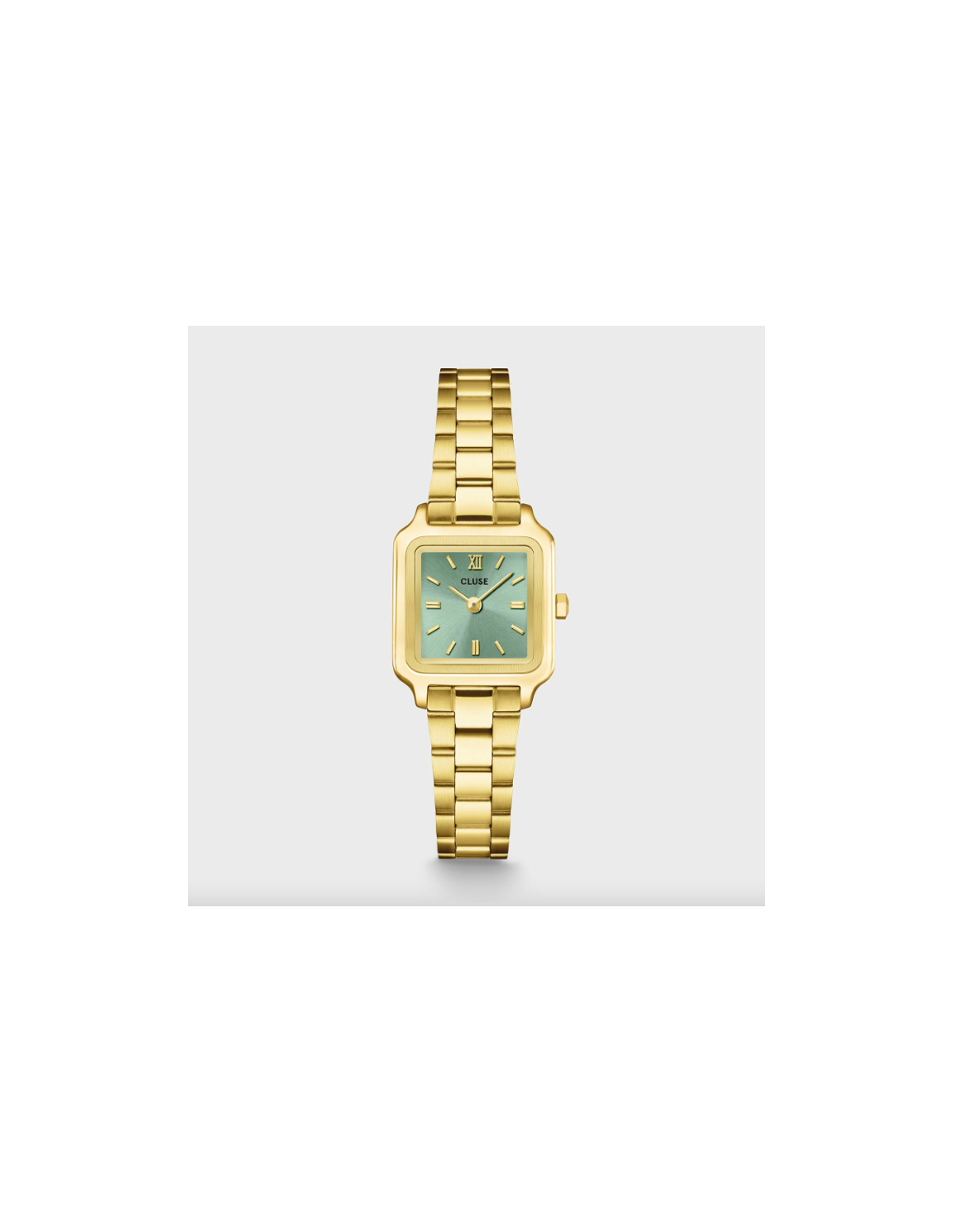 El reloj cuadrado Gracieuse Mini para mujer cuenta con una caja dorada de 21 mm, una esfera verde salvia de acabado sunray y una correa de acero inoxidable dorada de 12 mm.