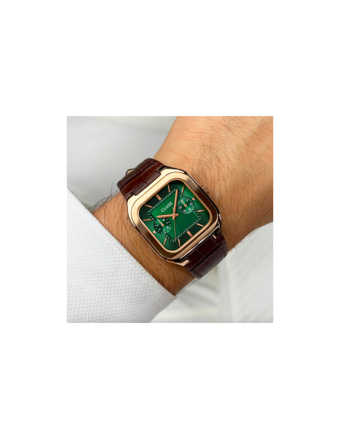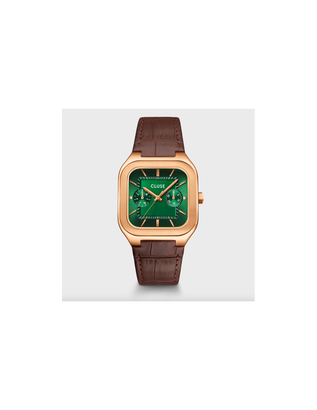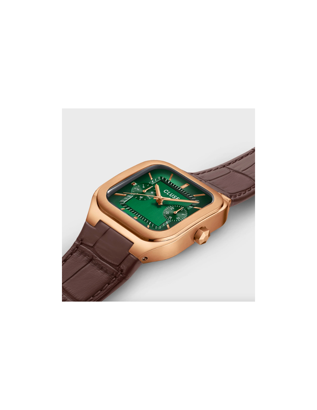 El reloj cuadrado Quadrus Multifunction para hombre cuenta con una caja de 35 mm de color oro rosa, una esfera verde con detalles de color oro rosa y una correa de piel marrón de 18 mm.
