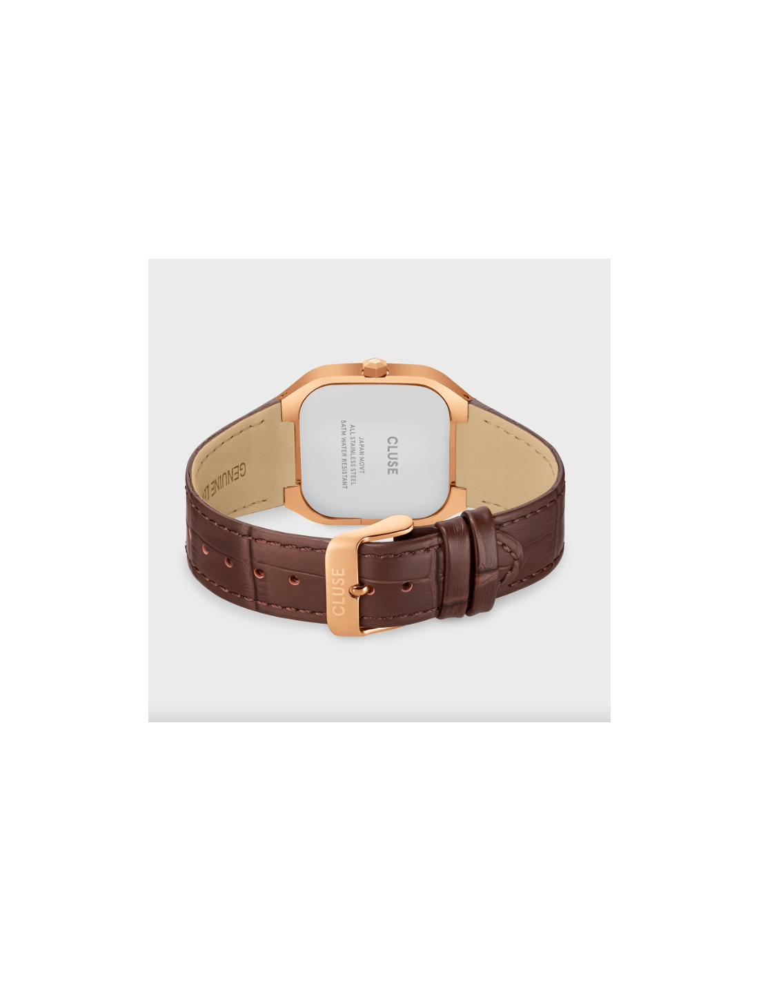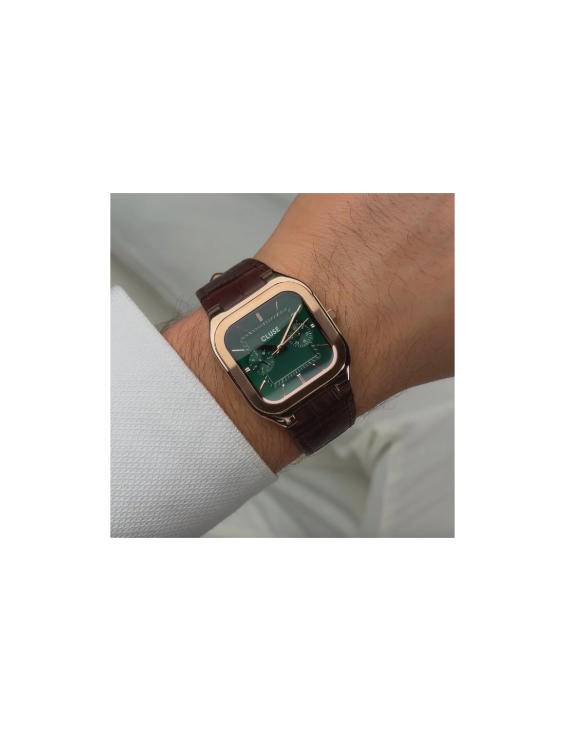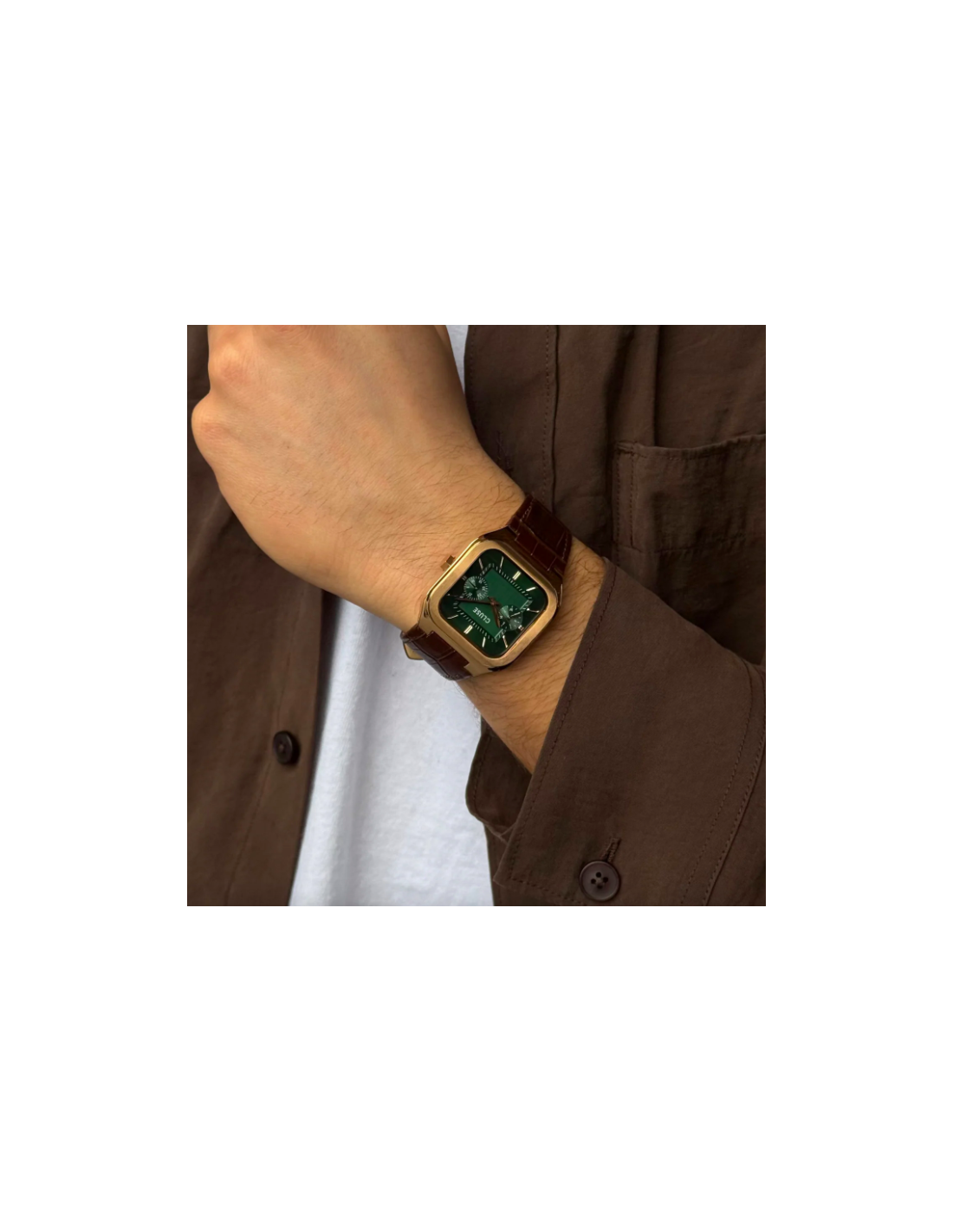 El reloj cuadrado Quadrus Multifunction para hombre cuenta con una caja de 35 mm de color oro rosa, una esfera verde con detalles de color oro rosa y una correa de piel marrón de 18 mm.