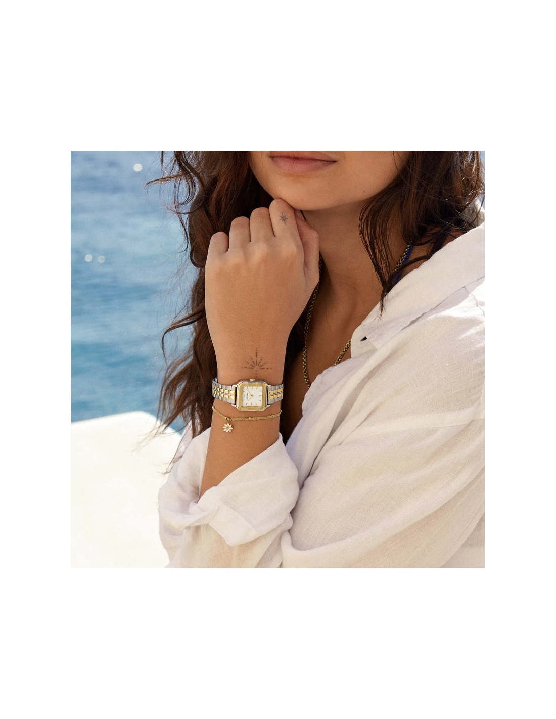 Con una caja cuadrada de 24 mm en color dorado y plateado, esfera blanca y correa de acero inoxidable de 14 mm en color dorado y plateado. Este llamativo bicolor añadirá un toque elegante a todos tus looks.