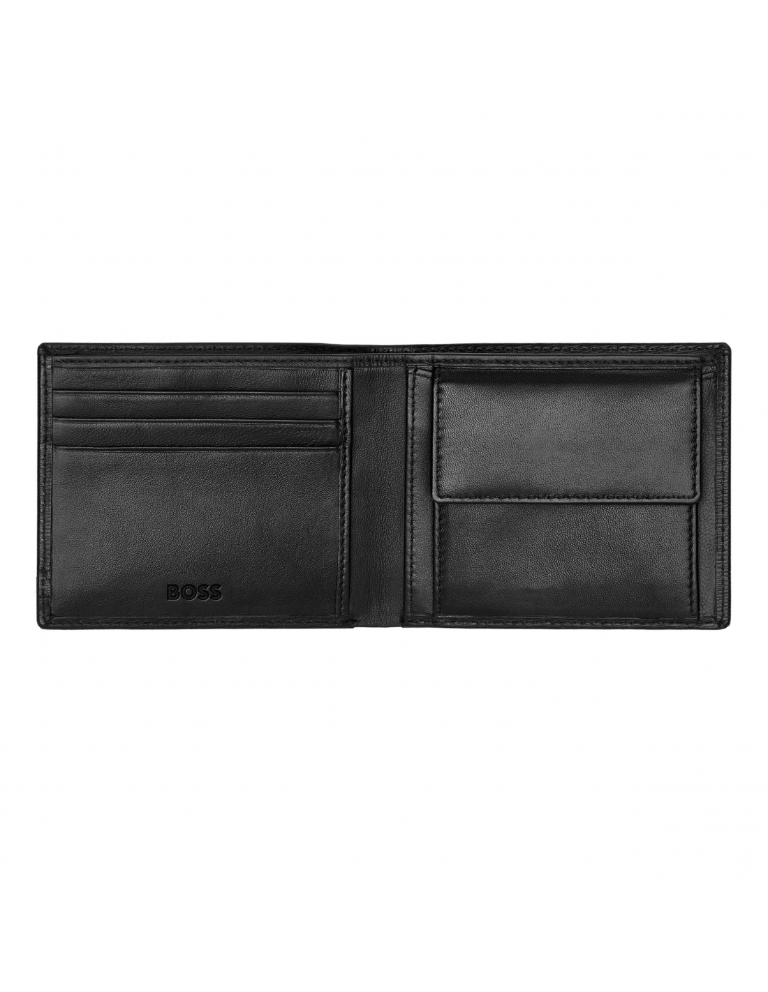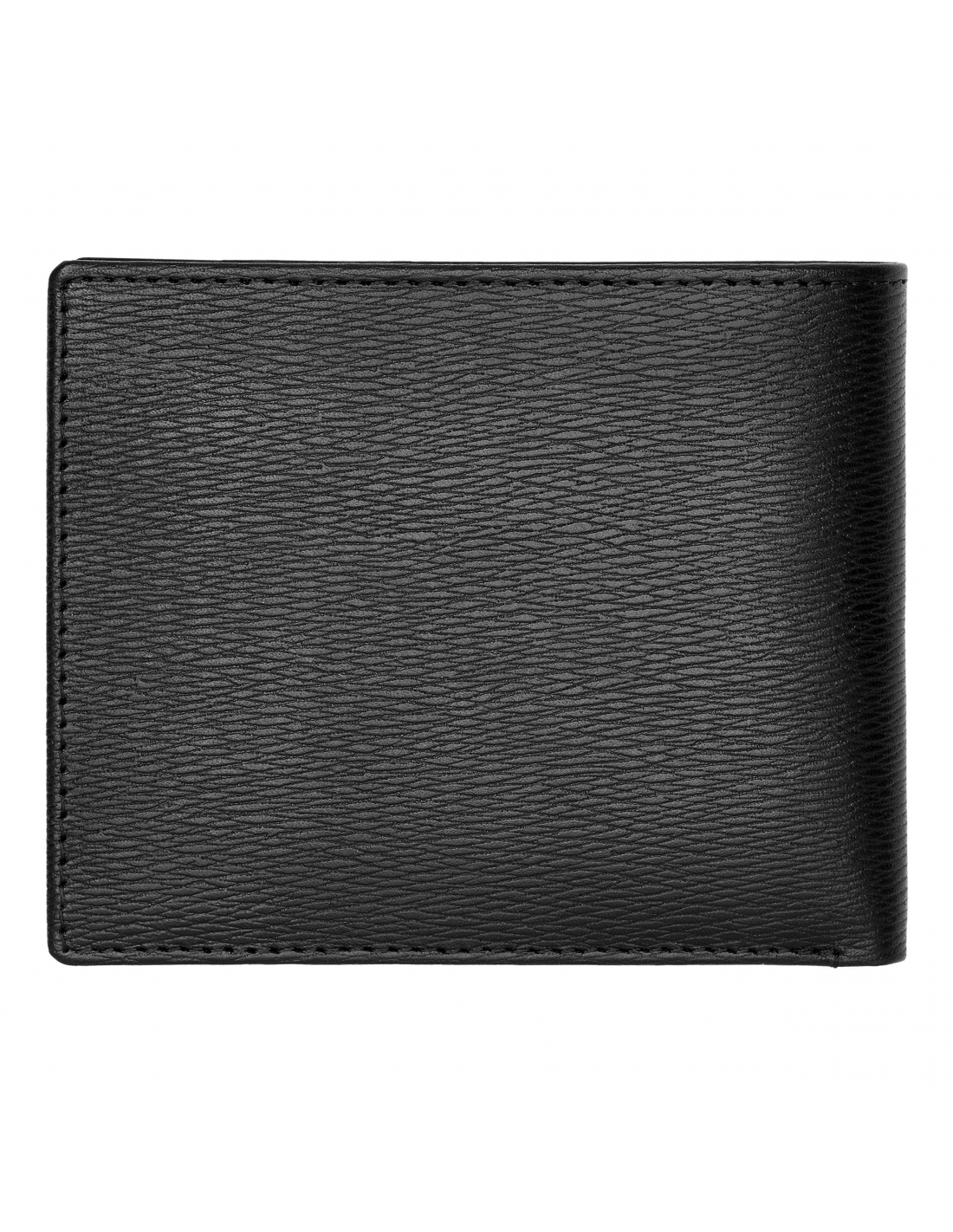 Billetera monedero unisex en piel negra con el nombre de la marca en metal y detalle de las rayas de la marca.