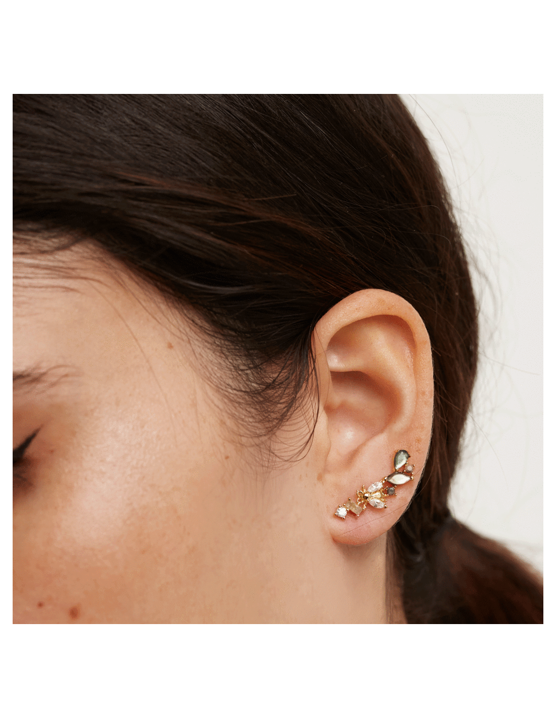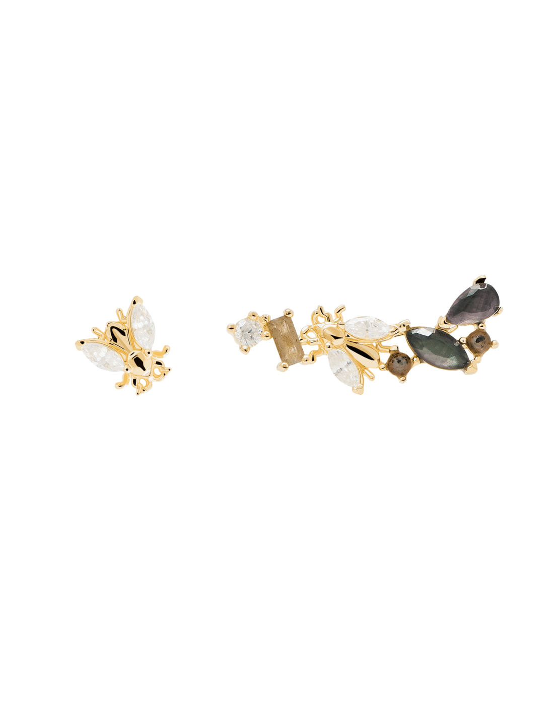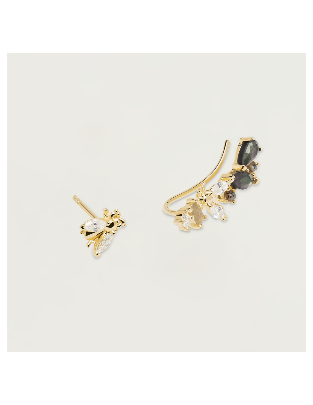 La colección Zaza se inspira en los virtuosos insectos voladores que mantienen la naturaleza en constante floración. La sutil belleza y fragilidad de estas pequeñas criaturas se captura en Cristales sobre Madreperla verde, aludiendo a esas alas que agitan rápidamente y a la iridiscencia de los cuerpos de los insectos salvajes. Mientras tanto, delicadas circonitas blancas se sientan como un sutil detalle ornamental sobre Plata 925 y un baño de oro de 18 quilates, evocando el centro de la vida en constante movimiento.