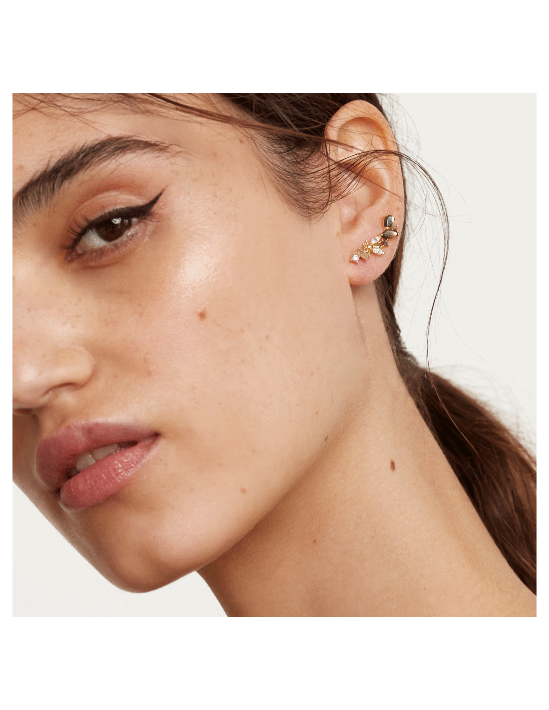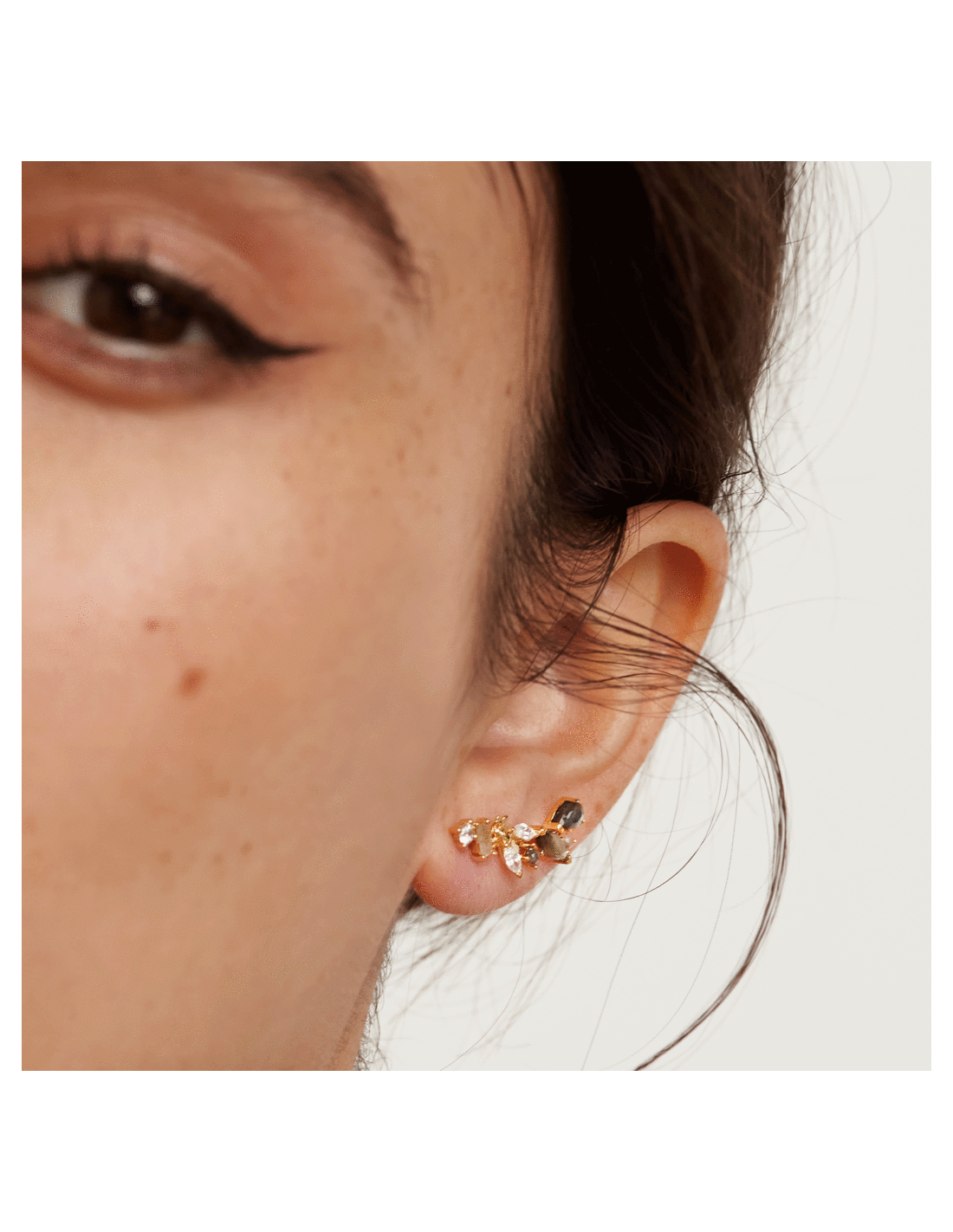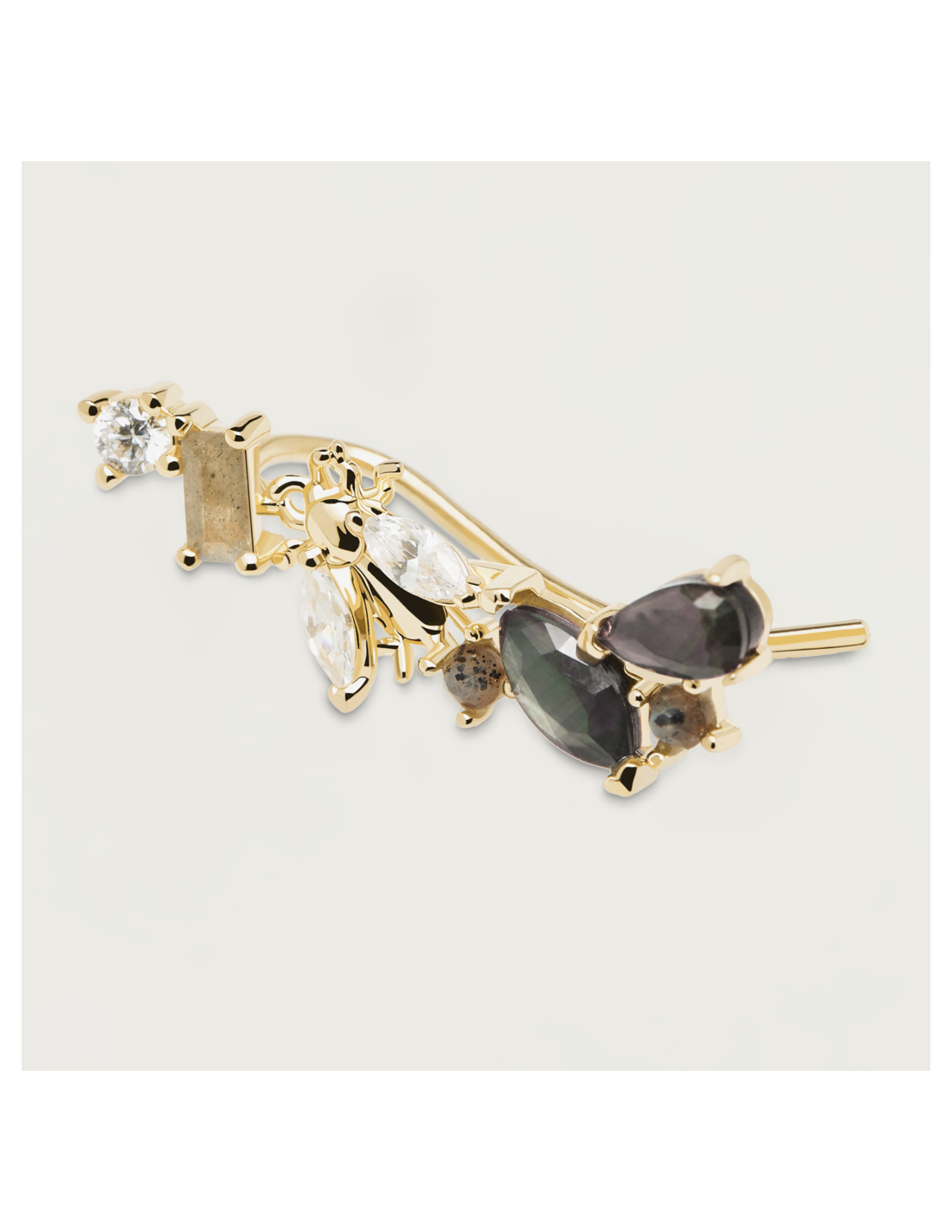 La colección Zaza se inspira en los virtuosos insectos voladores que mantienen la naturaleza en constante floración. La sutil belleza y fragilidad de estas pequeñas criaturas se captura en Cristales sobre Madreperla verde, aludiendo a esas alas que agitan rápidamente y a la iridiscencia de los cuerpos de los insectos salvajes. Mientras tanto, delicadas circonitas blancas se sientan como un sutil detalle ornamental sobre Plata 925 y un baño de oro de 18 quilates, evocando el centro de la vida en constante movimiento.