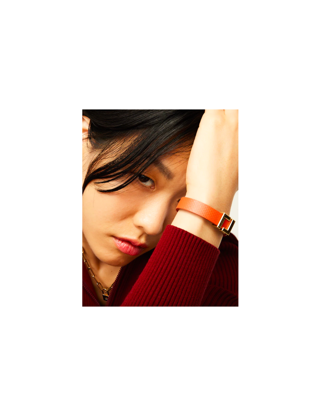 El moderno y femenino brazalete de cuero Lura con detalles de piqué y un emblemático cierre con la doble L de la marca lucirá con elegancia en la muñeca.