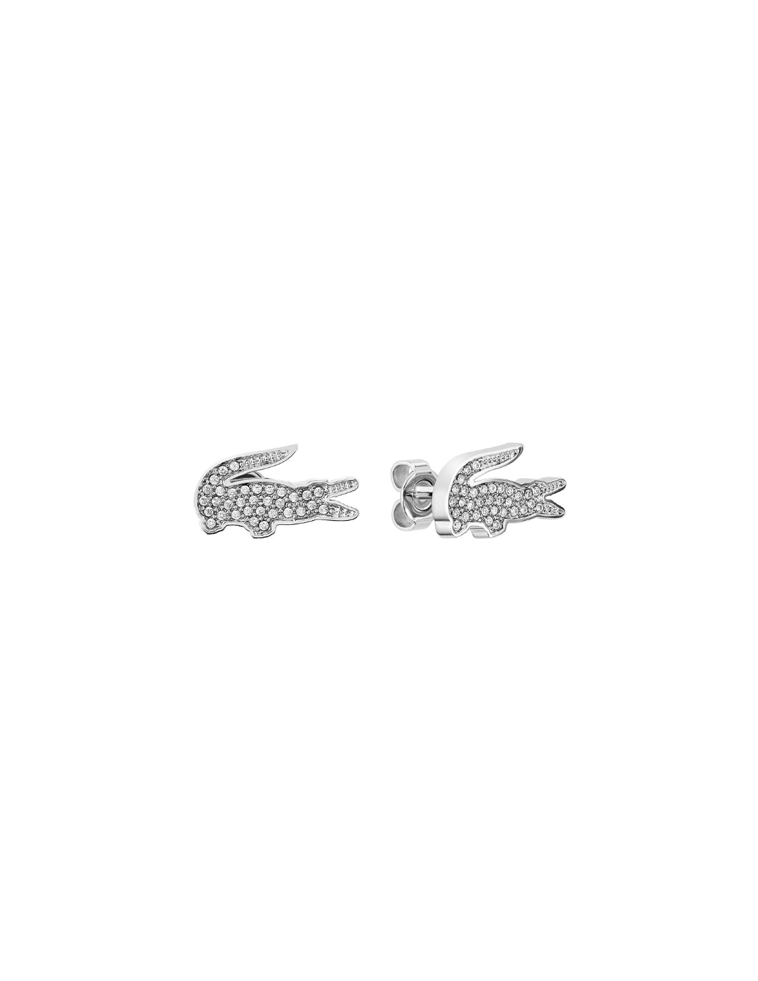 El característico cocodrilo define la colección Crocodile de Lacoste Jewelry, que se basa en el icono de la marca, en estos bonitos pendientes de acero en color plateado con cristales blancos.