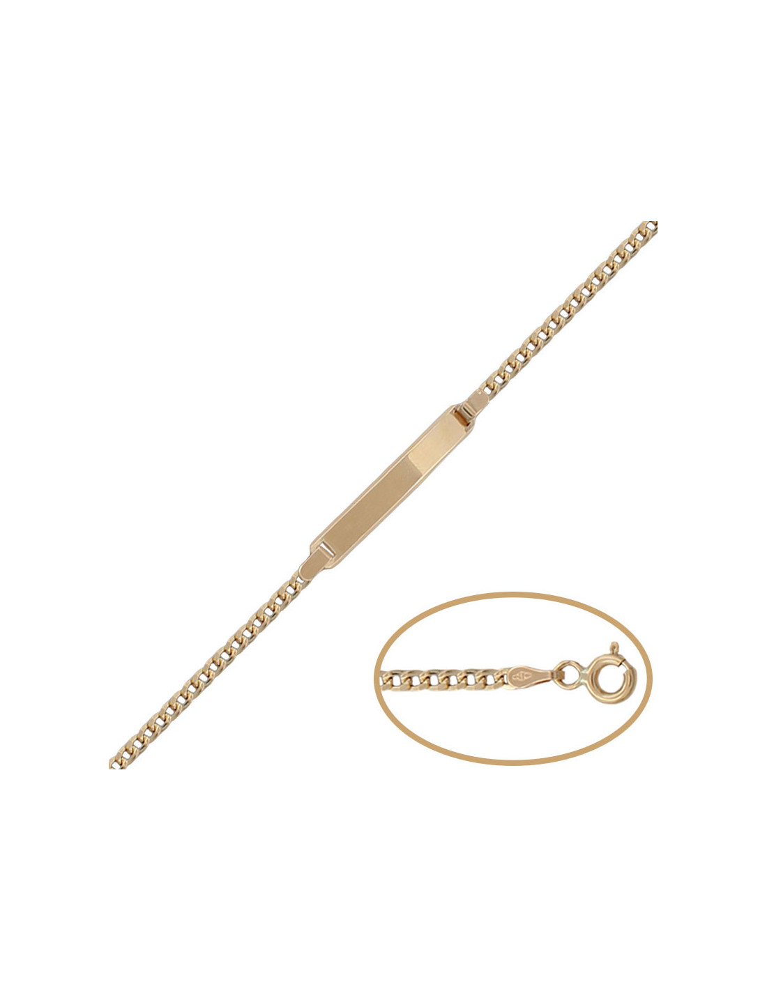 Eslabón barbado. Terminación en brillo. Ancho de cadena: 3mm. Ancho de placa: 4mm. Largo de 14.50 cm.Peso 2,1gr