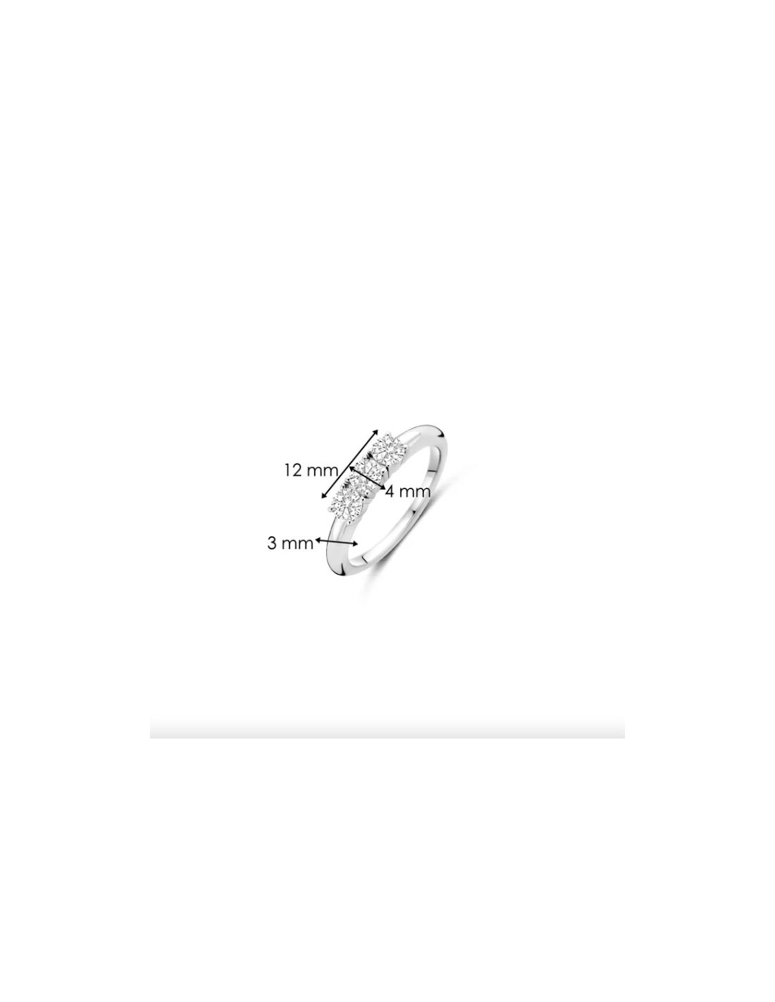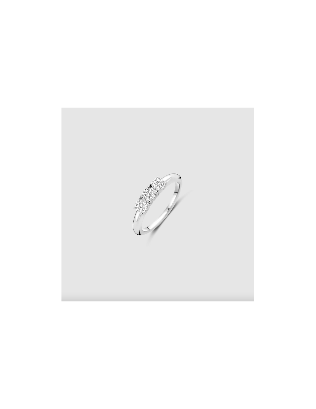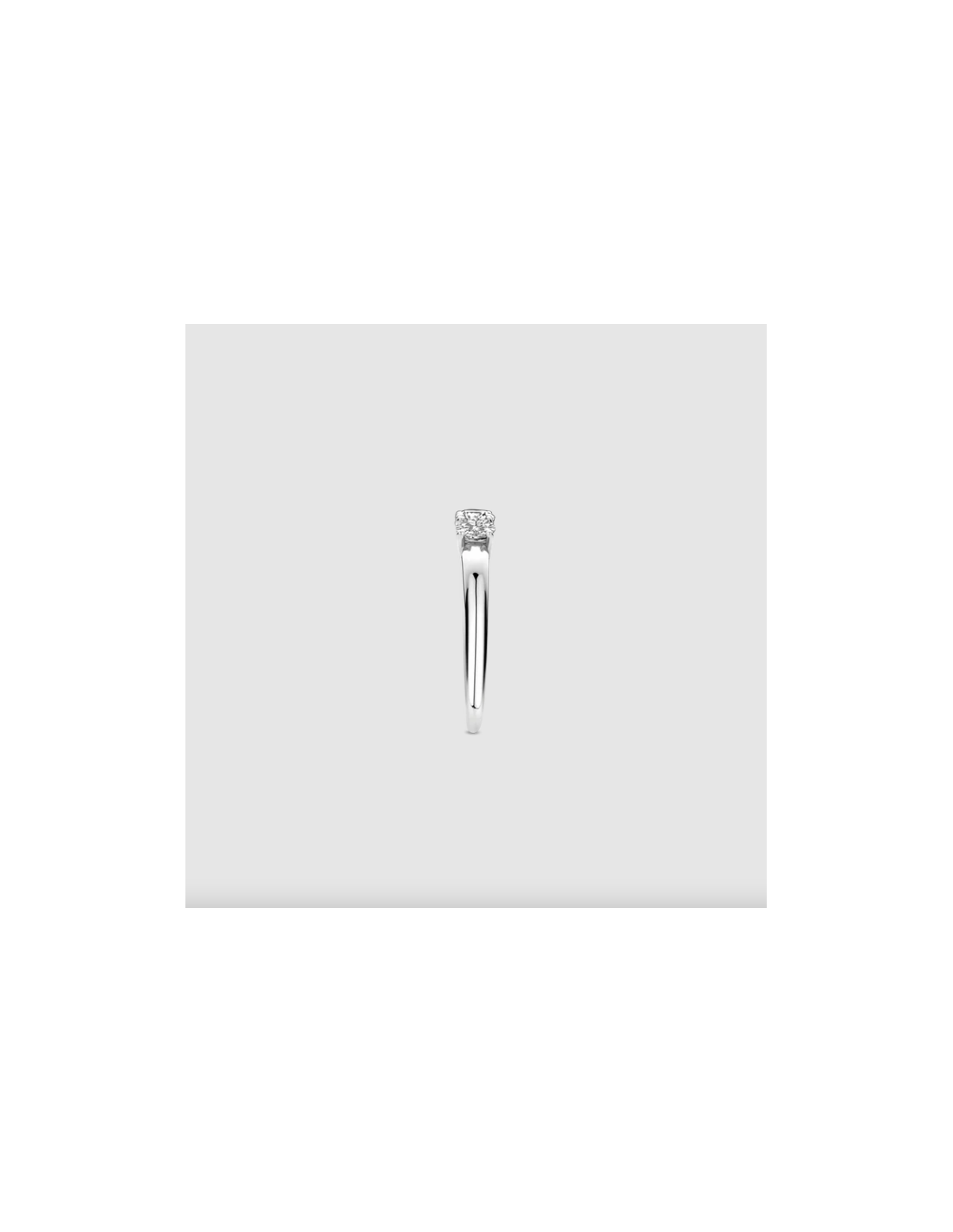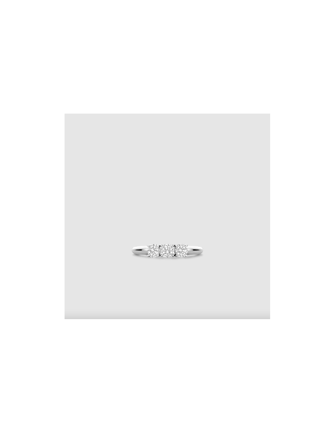 Elaborado en plata de ley 925 bañada con una lujosa capa de platino, el anillo presenta tres brillantes circonitas cúbicas blancas ubicadas en la parte superior de la banda. El baño de platino garantiza un brillo duradero, manteniendo la plata luminosa y protegida de arañazos.