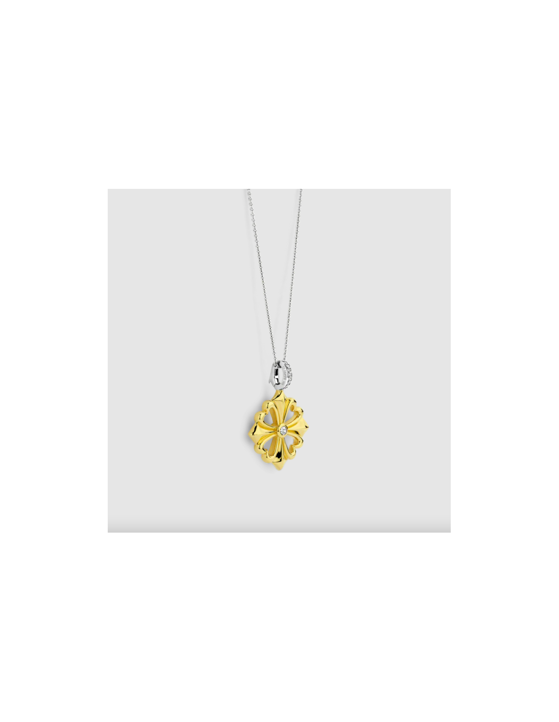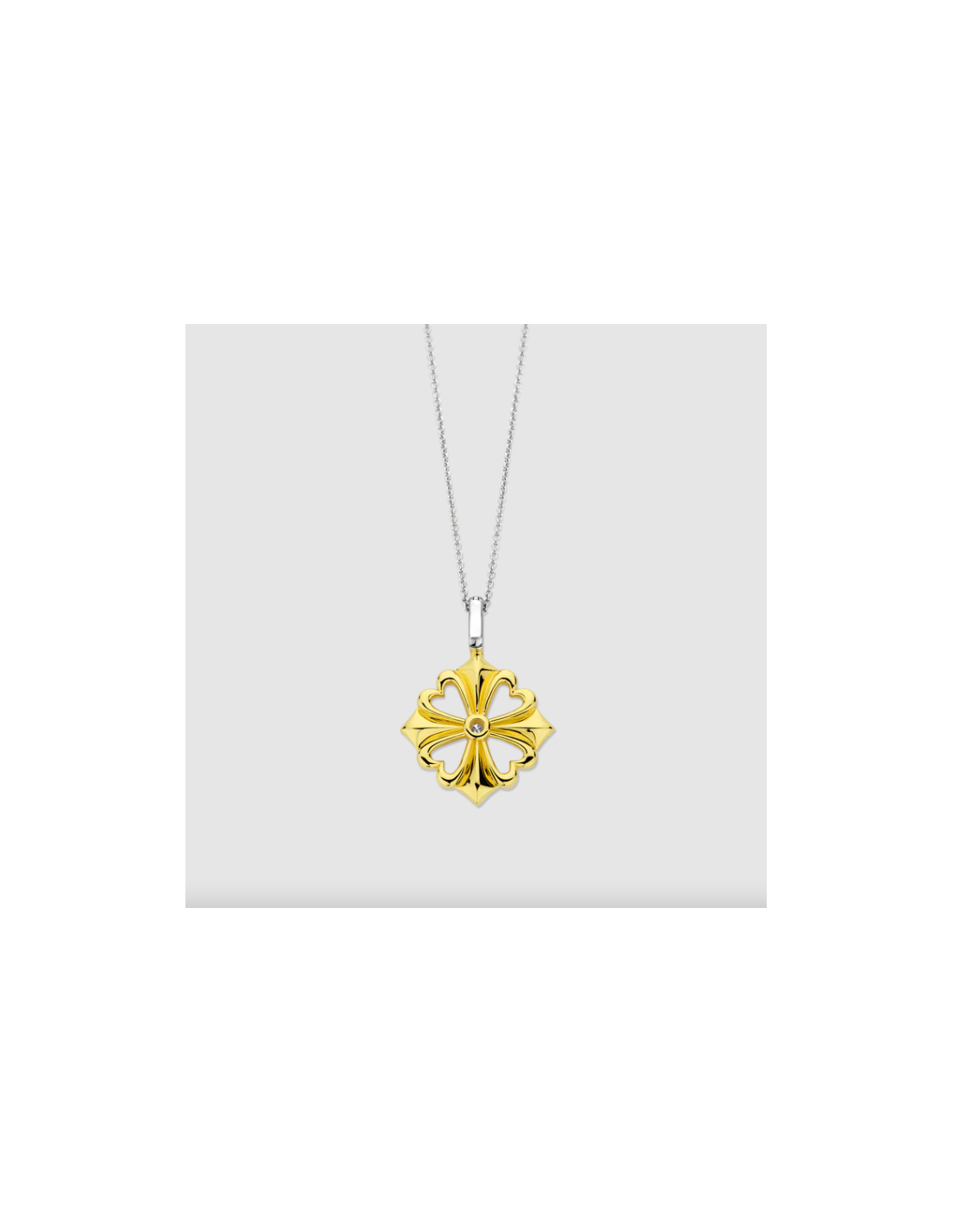 Elaborado en plata de ley 925 y chapado en oro amarillo brillante, este colgante presenta una encantadora forma de trébol adornada con una brillante circonita cúbica blanca en el centro.