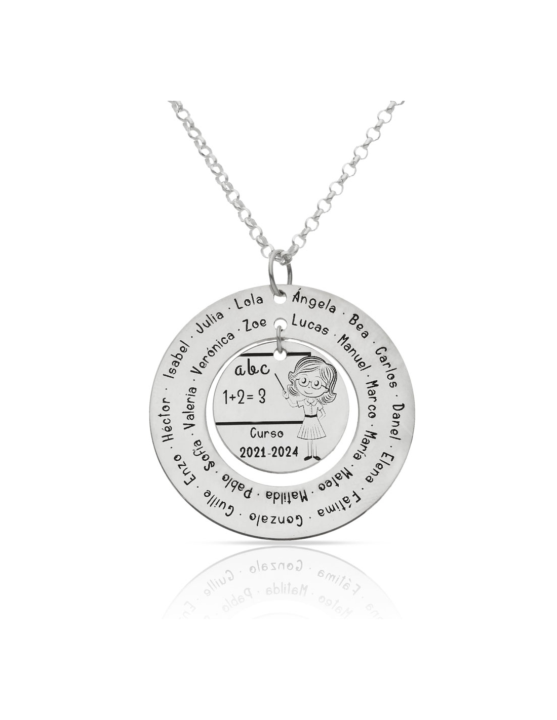 Gargantilla en Plata de Ley 925mm con dibujo de maestra + cerco con los nombres de los alumnos.