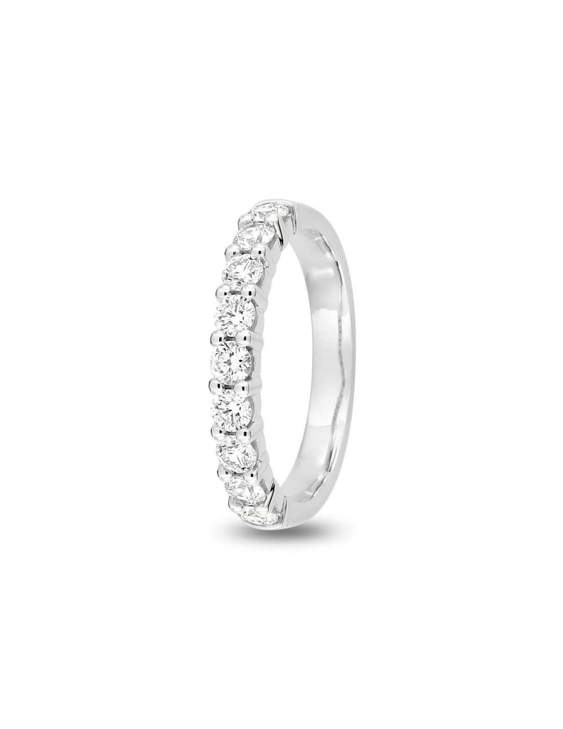 Anillo de compromiso de oro blanco con 9 diamantes que suman un peso de 0.70 quilates. Éstos son de talla brillante color GH, pureza SI y proceden de la naturaleza, cumpliendo con el Proceso de Kimberley. Se trata de una joya de oro blanco, preciosa como regalo de aniversario, alianza de boda o anillo de pedida de mano.