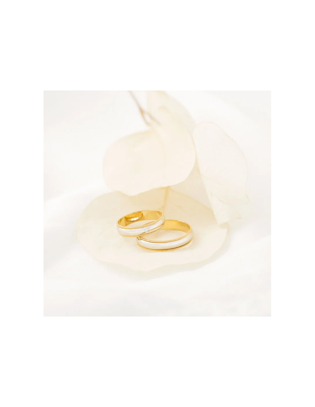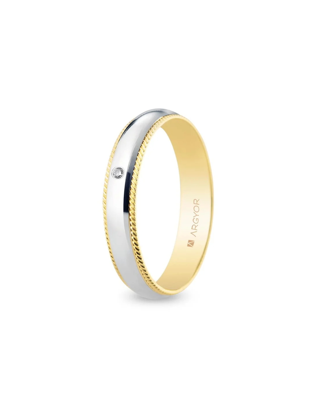 Alianza de boda bicolor de oro blanco y amarillo 18k de la colección de Argyor, con forma de media caña y laterales de oro amarillo con una filigrama. La alianzas tiene un diamante brillante (redondo) de 0.015 ct. Un anillo de boda clásico, con un toque de modernidad.