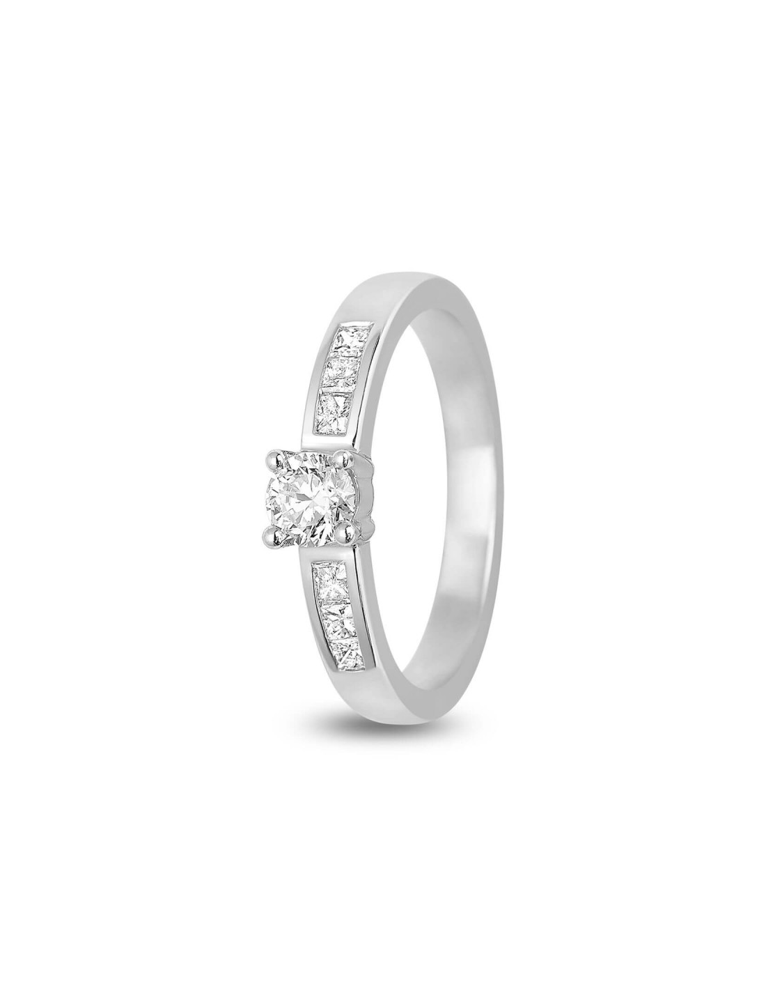Anillo de compromiso con un diseño único, en oro blanco de 18k, con un brillante central (0.33 ct) y dos filas de 3 diamantes princesa en carril a sus lados. El conjunto de los diamantes da a este anillo un brillo espectacular que no dejará indiferente a nadie. En total el anillo tiene 0.57ct de calidad GH-SI