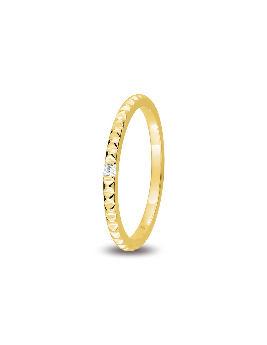 Alianza en oro de 18 quilates, diseñada por una fila de eslabones en forma de tachuela que le dan un toque rebelde y lleno de personalidad con una anchura de 1.60 milímetros, para aquellas novias que quieran un toque diferente ese día tan especial. Destaca el diamante princesa (cuadrado) de 0.02ct de calidad GH-SI que sustituye a una de las tachuelas.