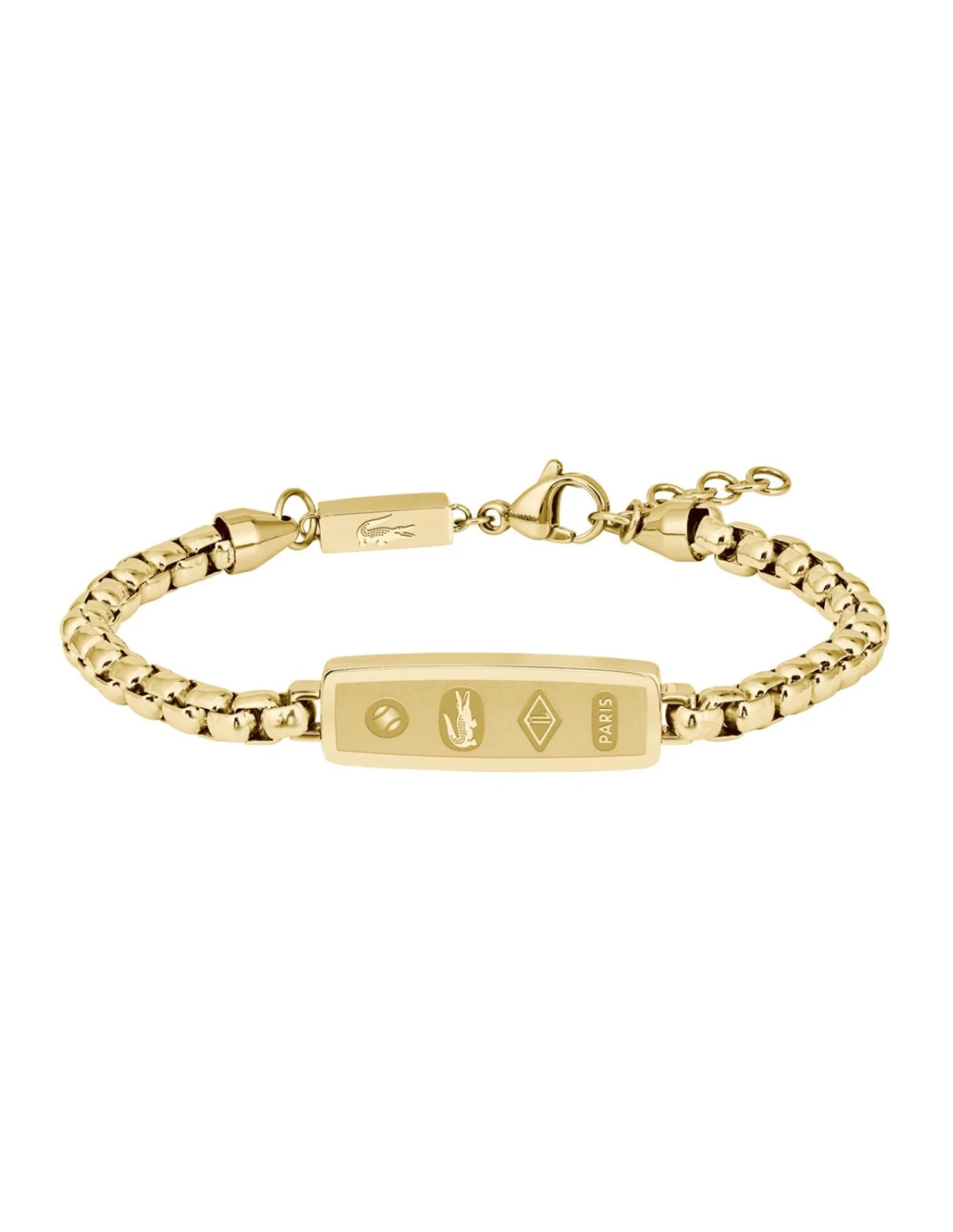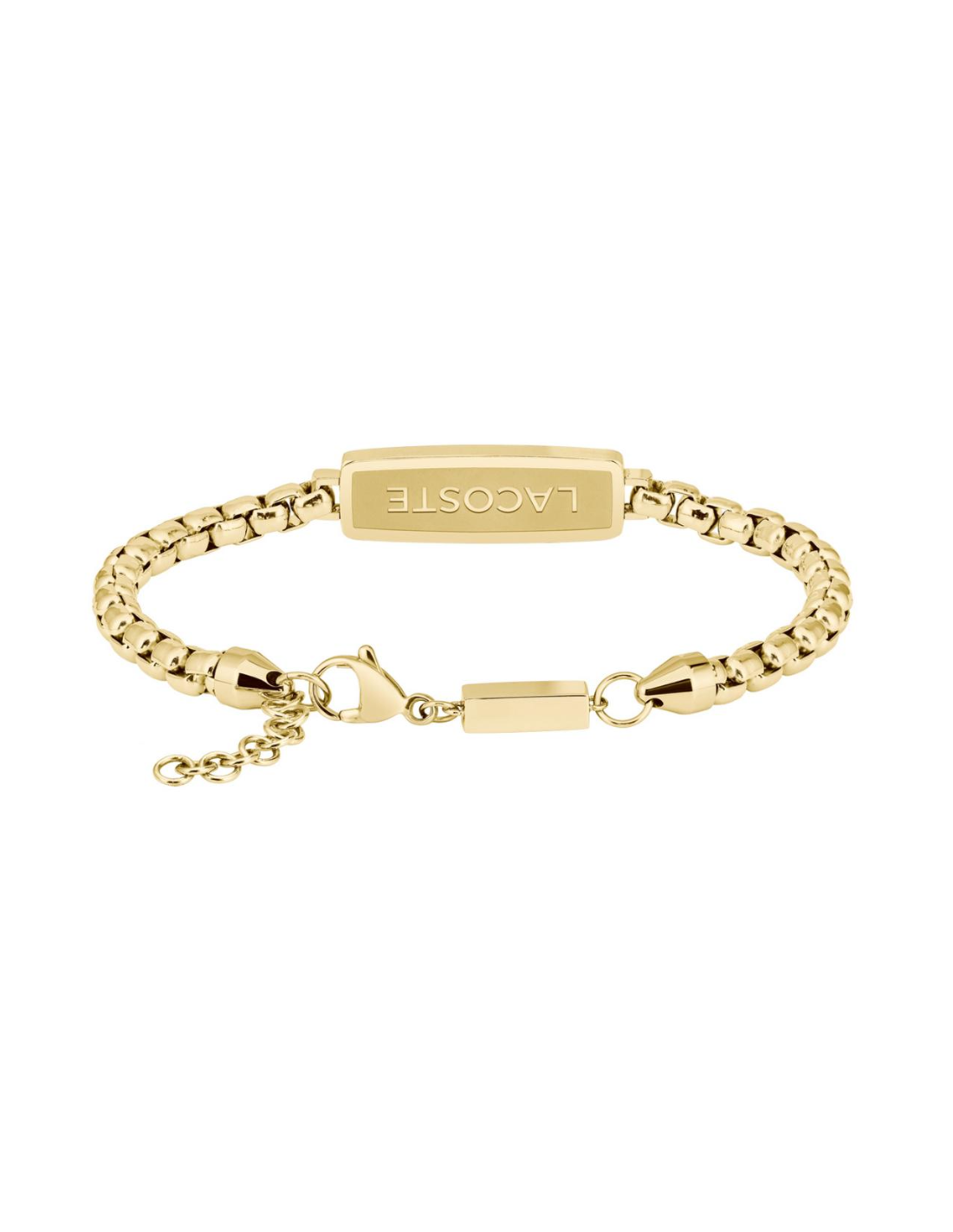 Pulsera Lacoste para hombre de la colección District fabricada en acero inoxidable pavonado en oro amarillo compuesta por una atractiva cadena que contiene una pieza rectangular con el logotipo e icono LACOSTE. Su cierre es de mosquetón ajustable mediante cadena extensible.