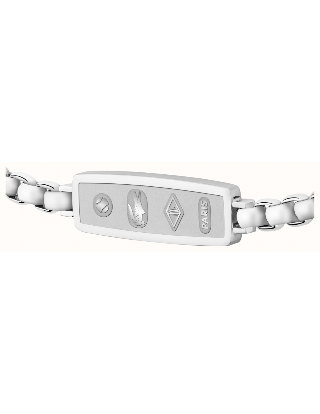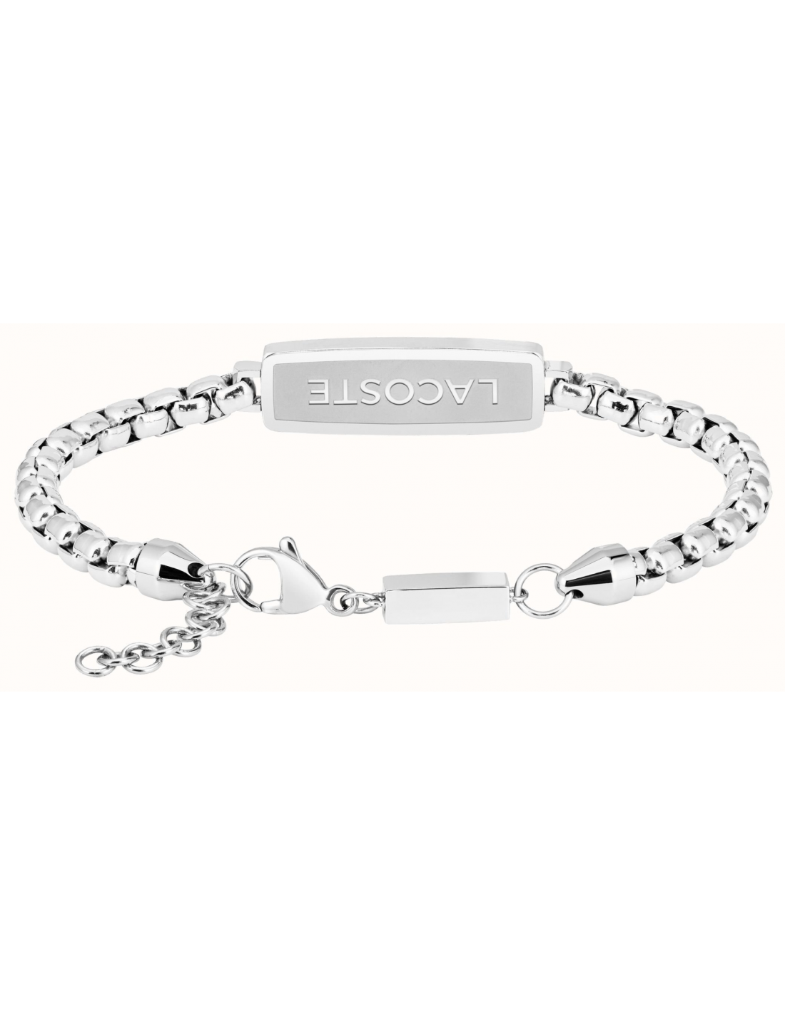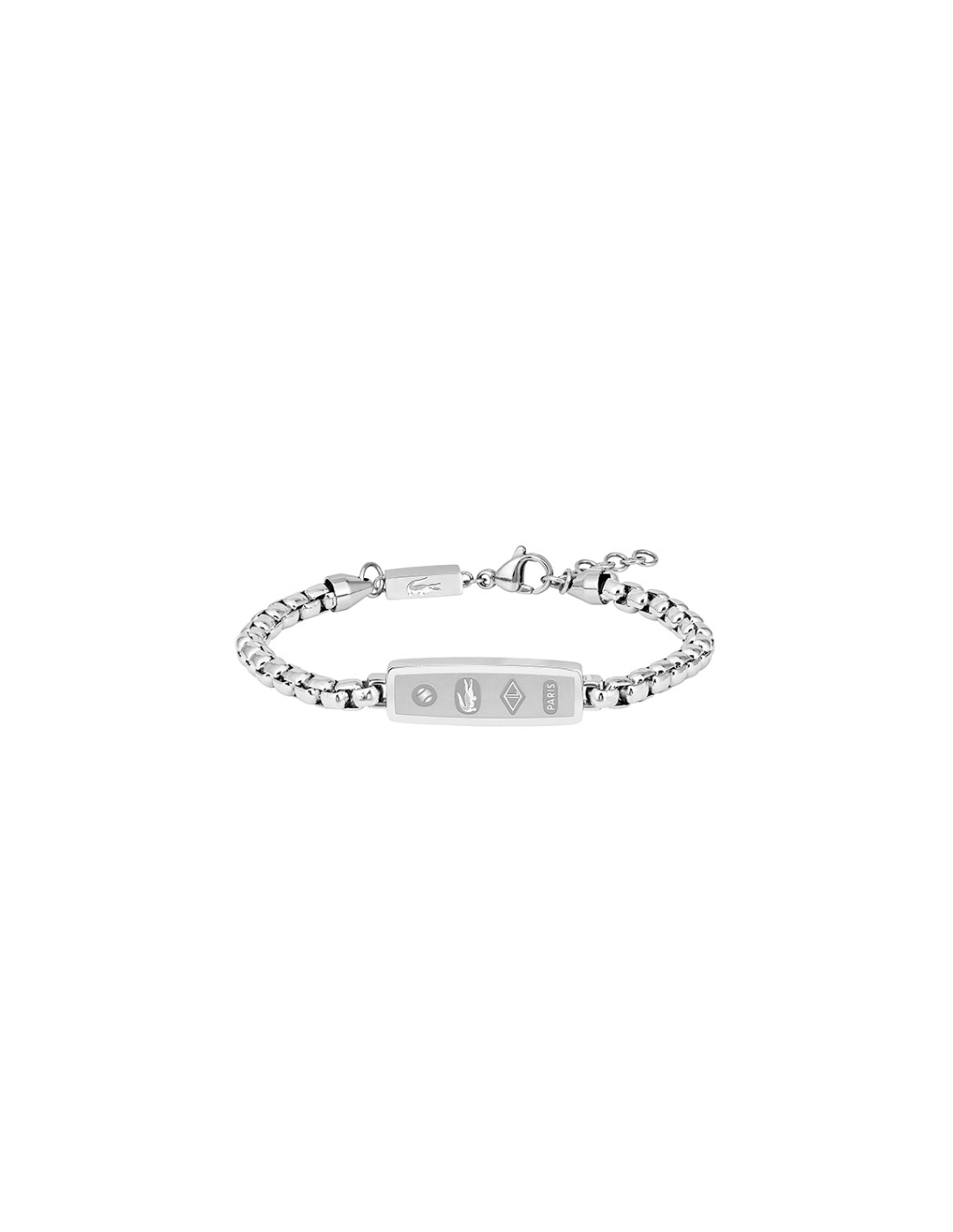 Pulsera Lacoste para hombre de la colección District fabricada en acero inoxidable plateado compuesta por una atractiva cadena que contiene una pieza rectangular con el logotipo e icono LACOSTE. Su cierre es de mosquetón ajustable mediante cadena extensible.