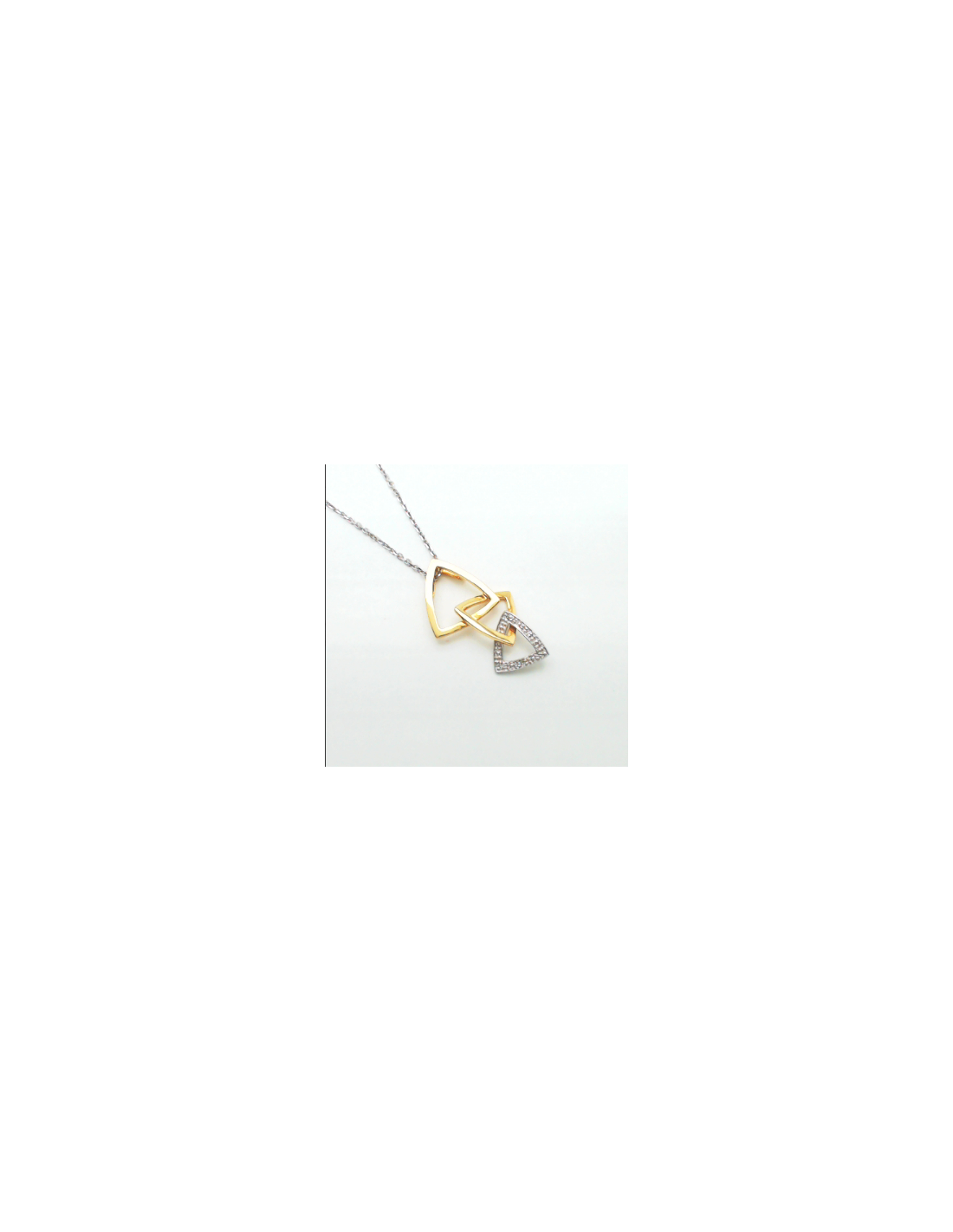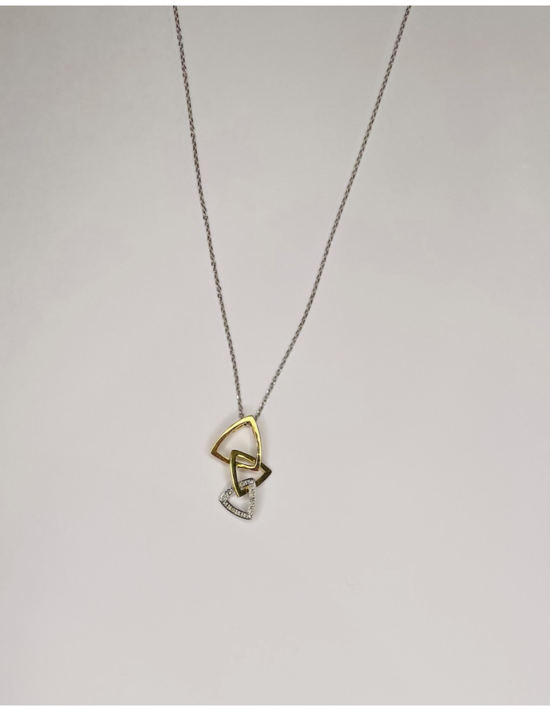 Formado por tres triángulos, el colgante mide 25,6mm de largo por 16,2mm de ancho, incluye una cadena de oro blanco de 40cm.