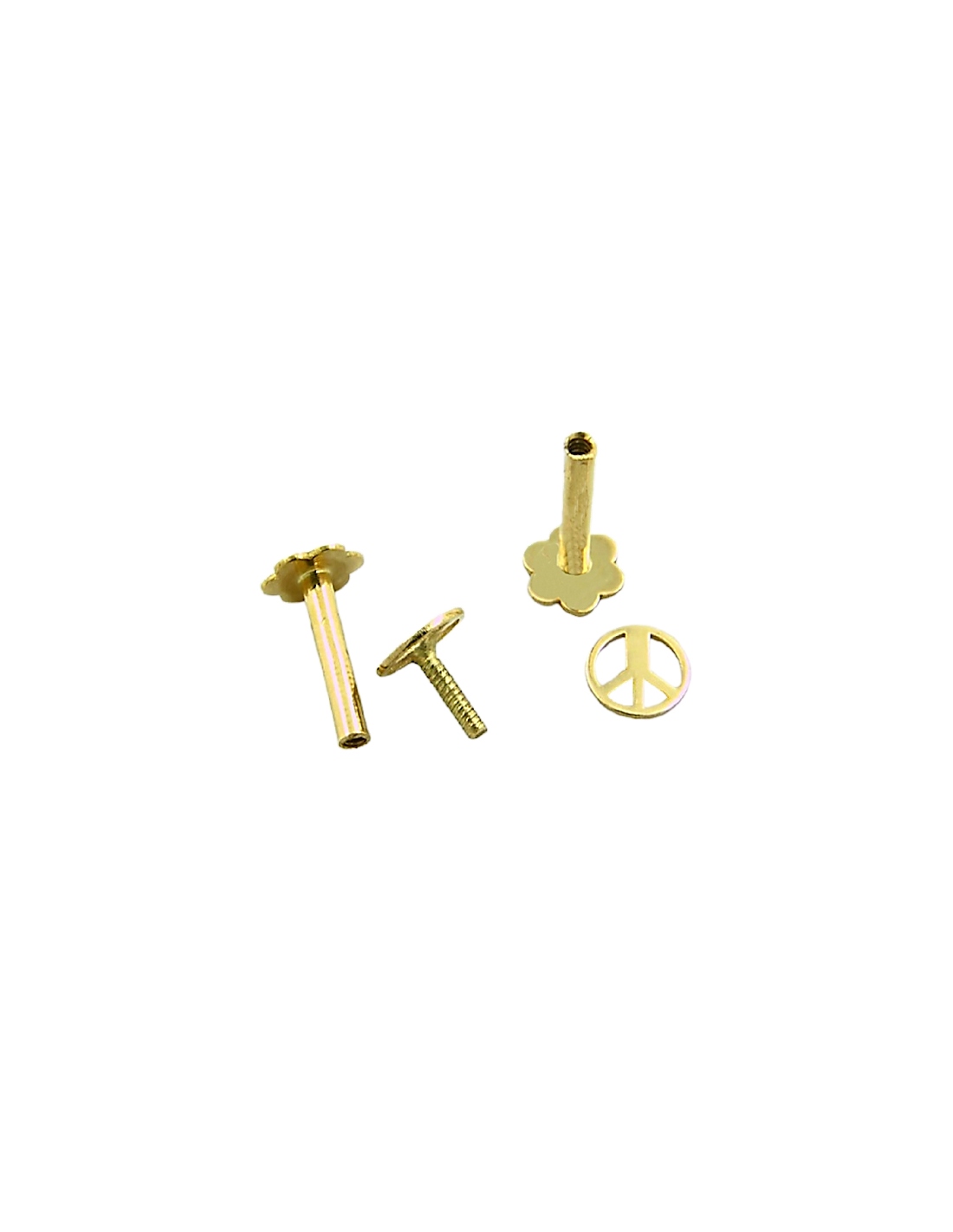 Piercing para cartilago formado por símbolo de la Paz liso y calado, mide 0.3 mm. de grueso y 3.7 mm. de diámetro y en la parte inferior un palillo de 3.9 mm. de largo con muescas para cerrar a tuerca, la otra parte esta formada por una flor con 6 pétalos de 3.5 mm. de diámetro y un palillo de 1 mm. de grueso y 6.1 mm. de largo y que es donde enrosca la flor de 5 pétalos, todo el metal en oro amarillo de 18kl