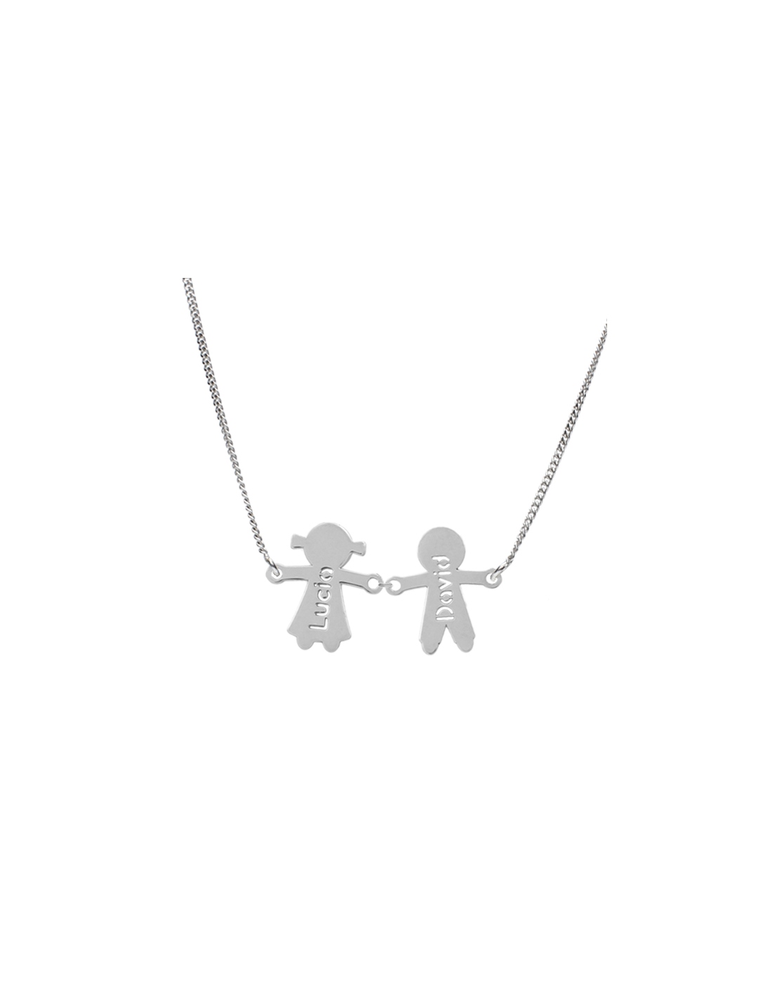 Gargantilla de niño + niña en Plata de Ley 925mm con opción de personalizar con nombres calados. Terminación en brillo.