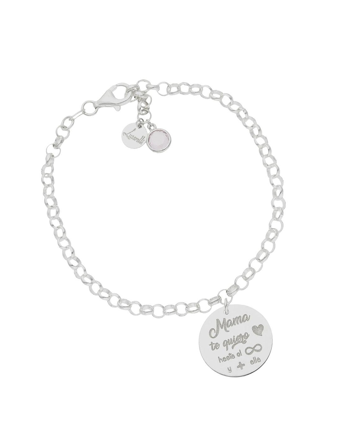 Pulsera MI HISTORIA INFINITO Y MAS ALLA · Creada especialmente para ti. Plata de Ley 925mm. Incluye cadena rolot de 4mm de ancho con opción de colocar la pulsera en varias posiciones de largos. Terminación en brillo. Terminal con piedra en color rosa. Largo de 20 cm.