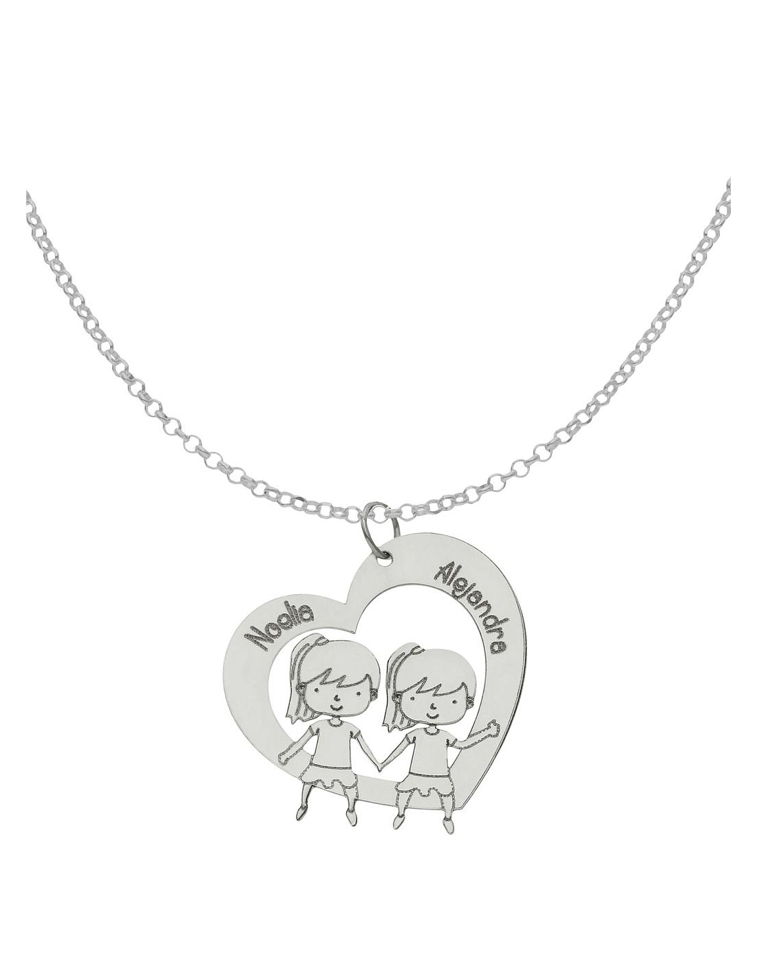 Gargantilla corazón + niñas en Plata de Ley 925mm personalizable con nombres.
