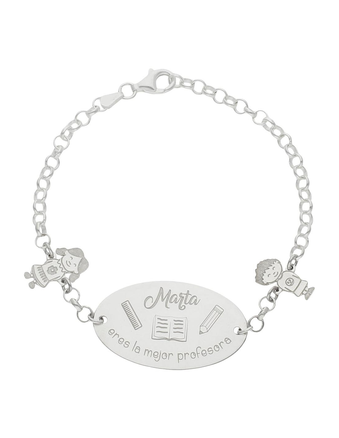 Pulsera profe con motivo ovalado + niña + niño en Plata de Ley 925mm con frase: ERES LA MEJOR PROFESORA