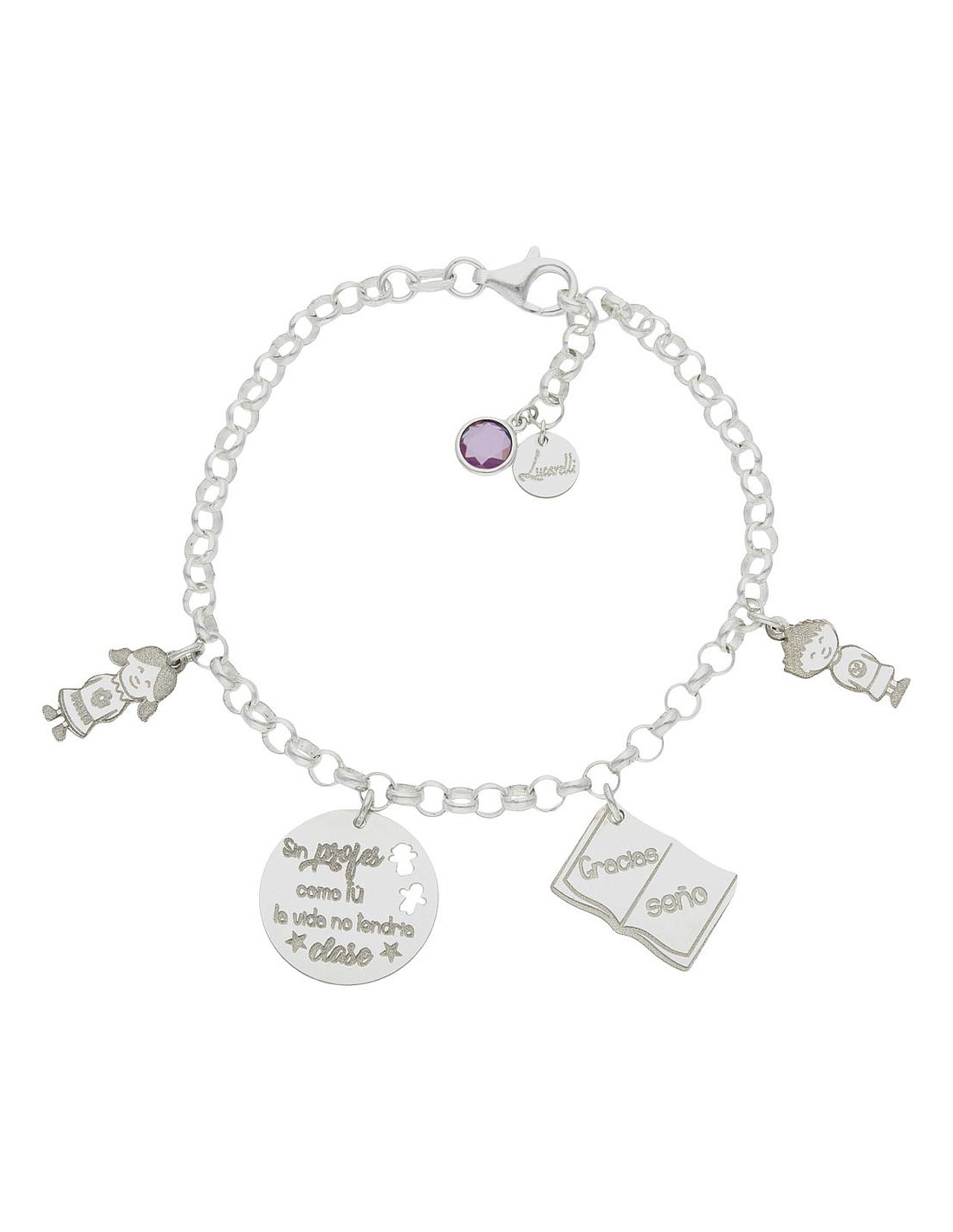 Pulsera MI HISTORIA MI PROFE · Creada especialmente para ti. Plata de Ley 925mm. Incluye cadena rolot de 4mm de ancho con opción de colocar la pulsera en varias posiciones de largos. Terminación en brillo. Terminal con piedra en color lila. Largo de 20 cm.
