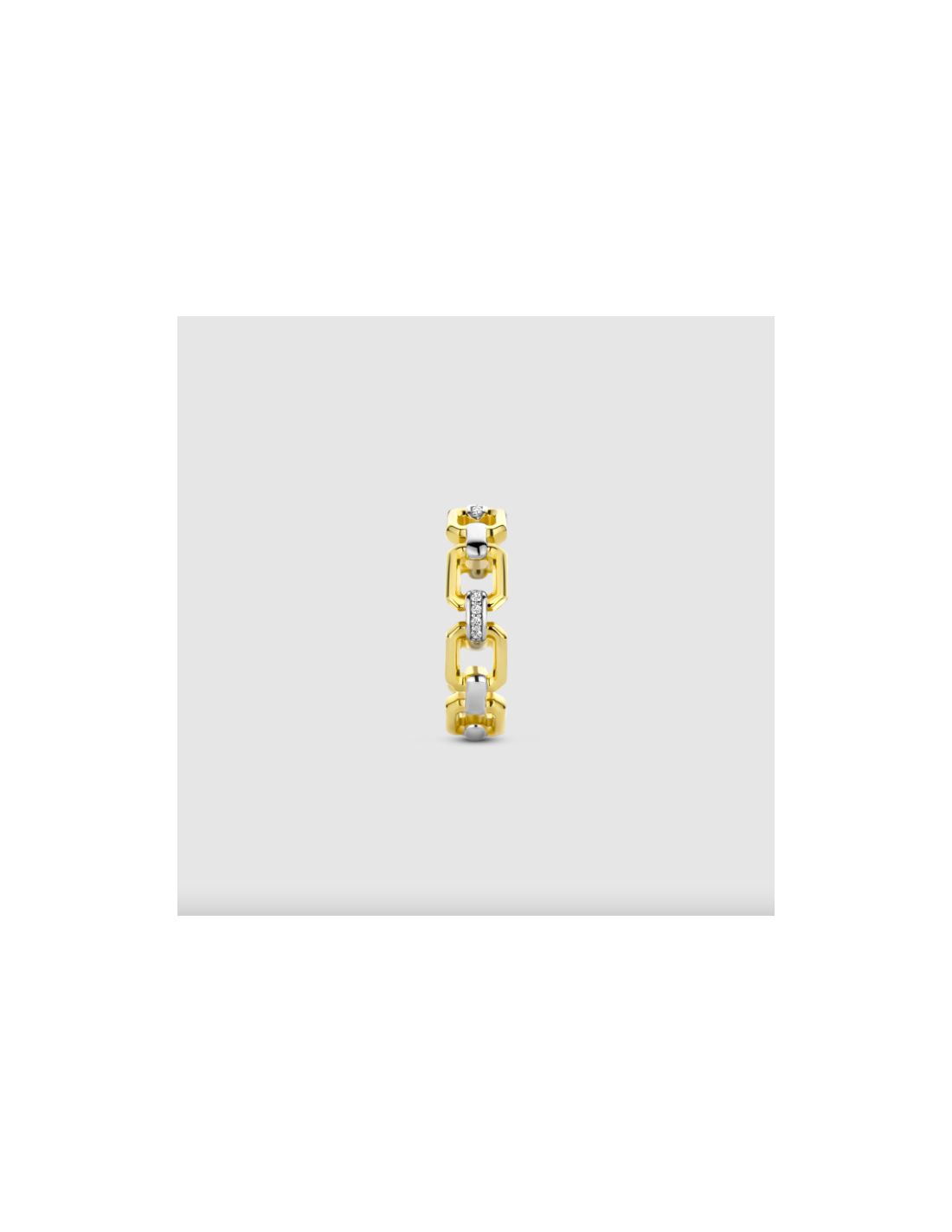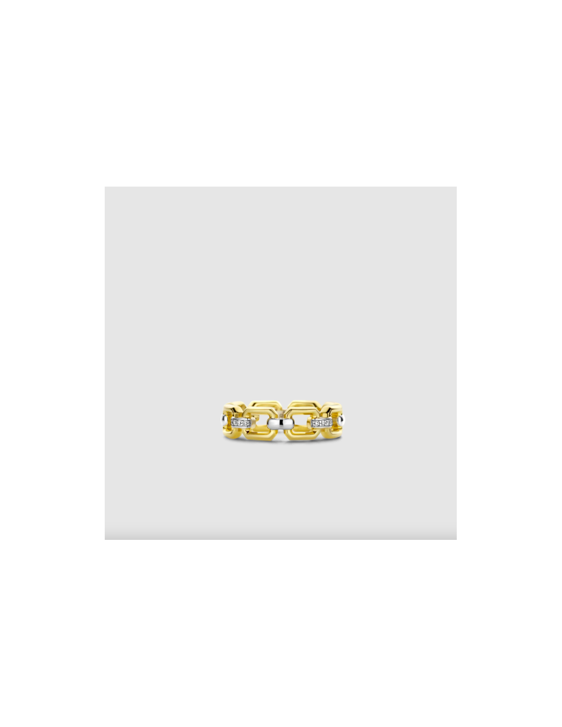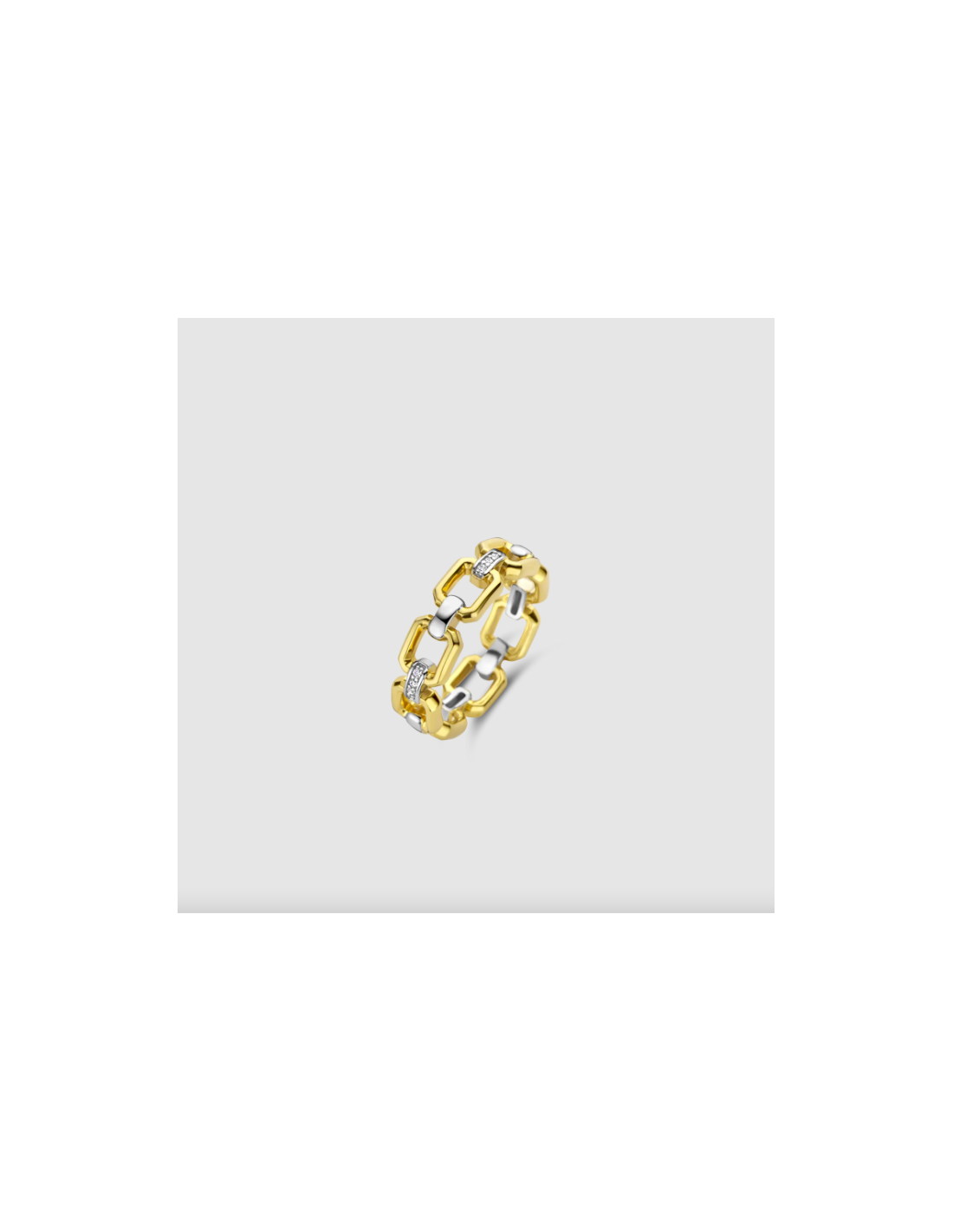 Este anillo de plata con baño de oro TI SENTO - Milano 12292ZY con forma de cadena, entrelazados por pequeños eslabones pavé.