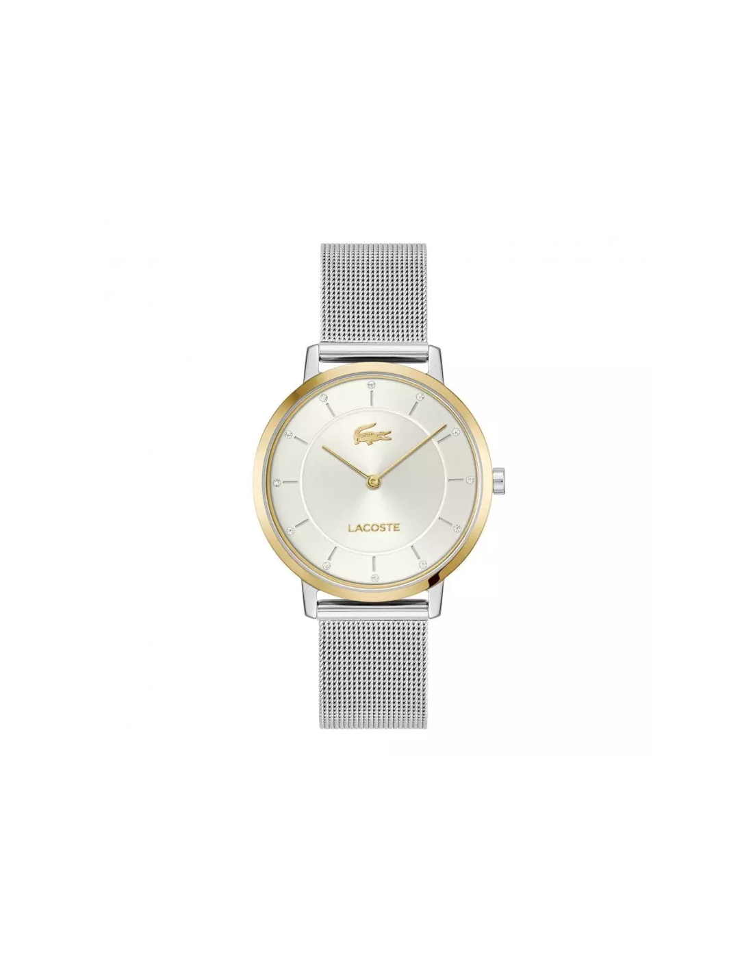 Reloj Lacoste para mujer de la colección Crocorigini fabricado en acero inoxidable plateado y dorado. Estamos ante un reloj de diseño elegante y femenino compuesto por caja de 35mm de diámetro con bisel dorado que contiene esfera plateada con indicadores en forma de barras blancas y agujas en dorado movidas por mecanismo de cuarzo analógico protegido por cristal mineral. Su brazalete es de malla milanesa con cierre deslizante de seguridad. Resistente al agua hasta 5 ATM.