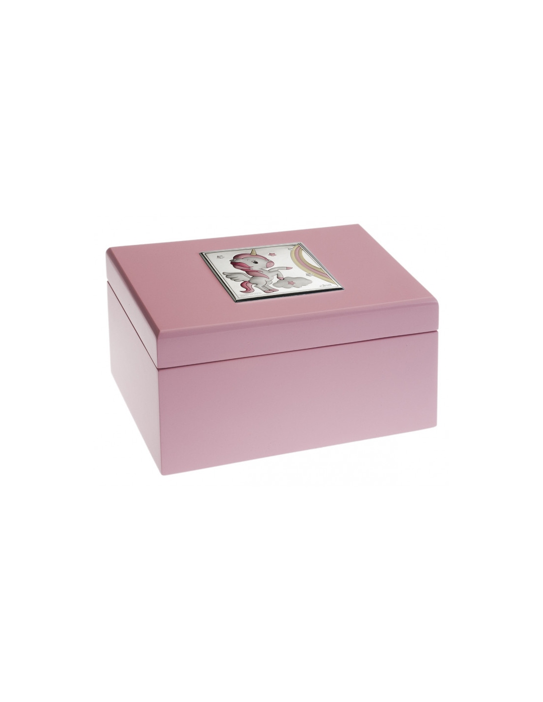 Joyero musical de color rosa con una bonita chapa con un unicornio en la parte superior. Forrado en una suave tela beige.