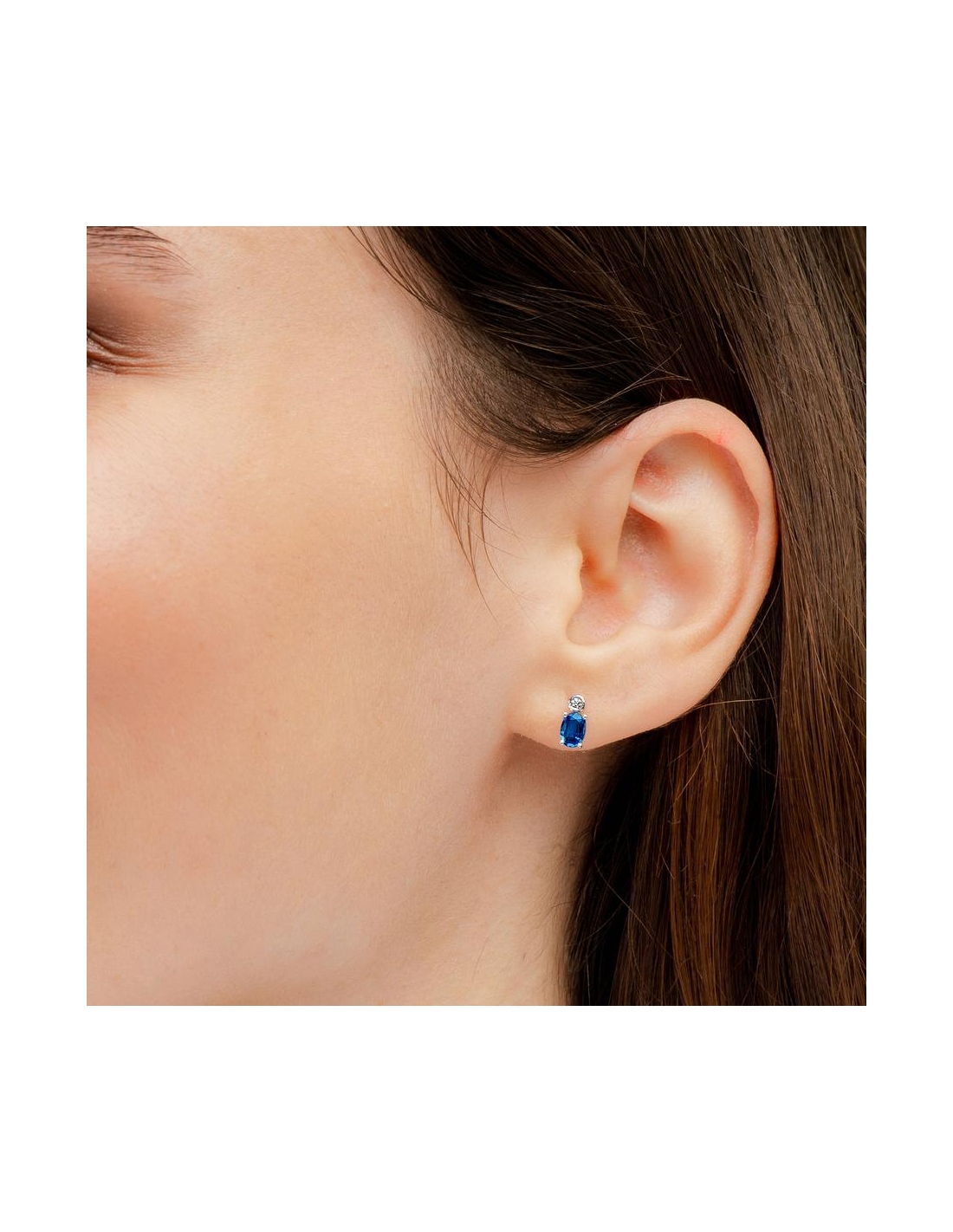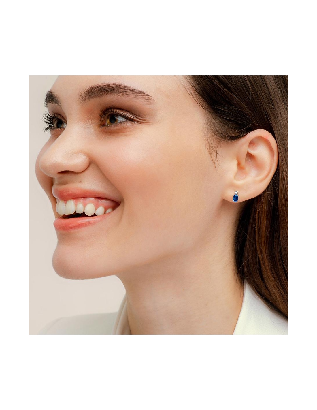 El diamante es de talla brillante y el zafiro de talla oval, protagonizando la pieza. Los pendientes tienen un cierre a presión, y miden 11mm de largo.
