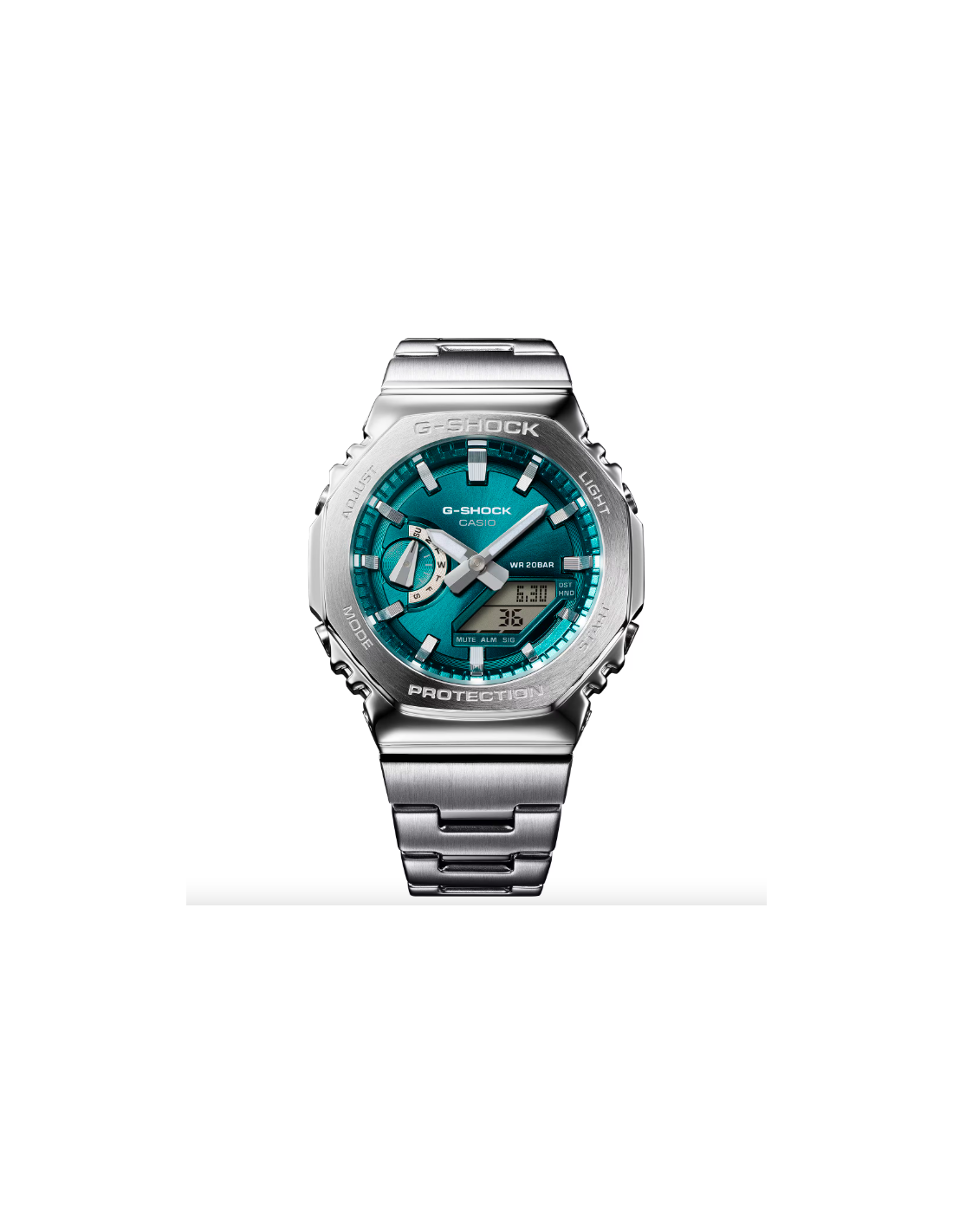 Echa un vistazo al GM-2110D: el icónico GA-2100 analógico-digital, pero con un elegante bisel metálico y una banda actualizada. Meticulosamente forjado, cortado y pulido, el bisel metálico octogonal uniforme ancla la misma construcción resistente en un diseño sencillo y sin complicaciones. Con su caja de resina fina reforzada con fibra de vidrio de alta rigidez, su brillante esfera metálica -en un sofisticado verde azulado o en un lujoso gris pizarra- y su correa metálica, este reloj está preparado para todo, trabajo o diversión. Continuando con el legado del primer G-SHOCK, el GM-2110D está totalmente comprometido con la leyenda de la marca: en diseño, forma, tamaño y resistencia a los golpes.