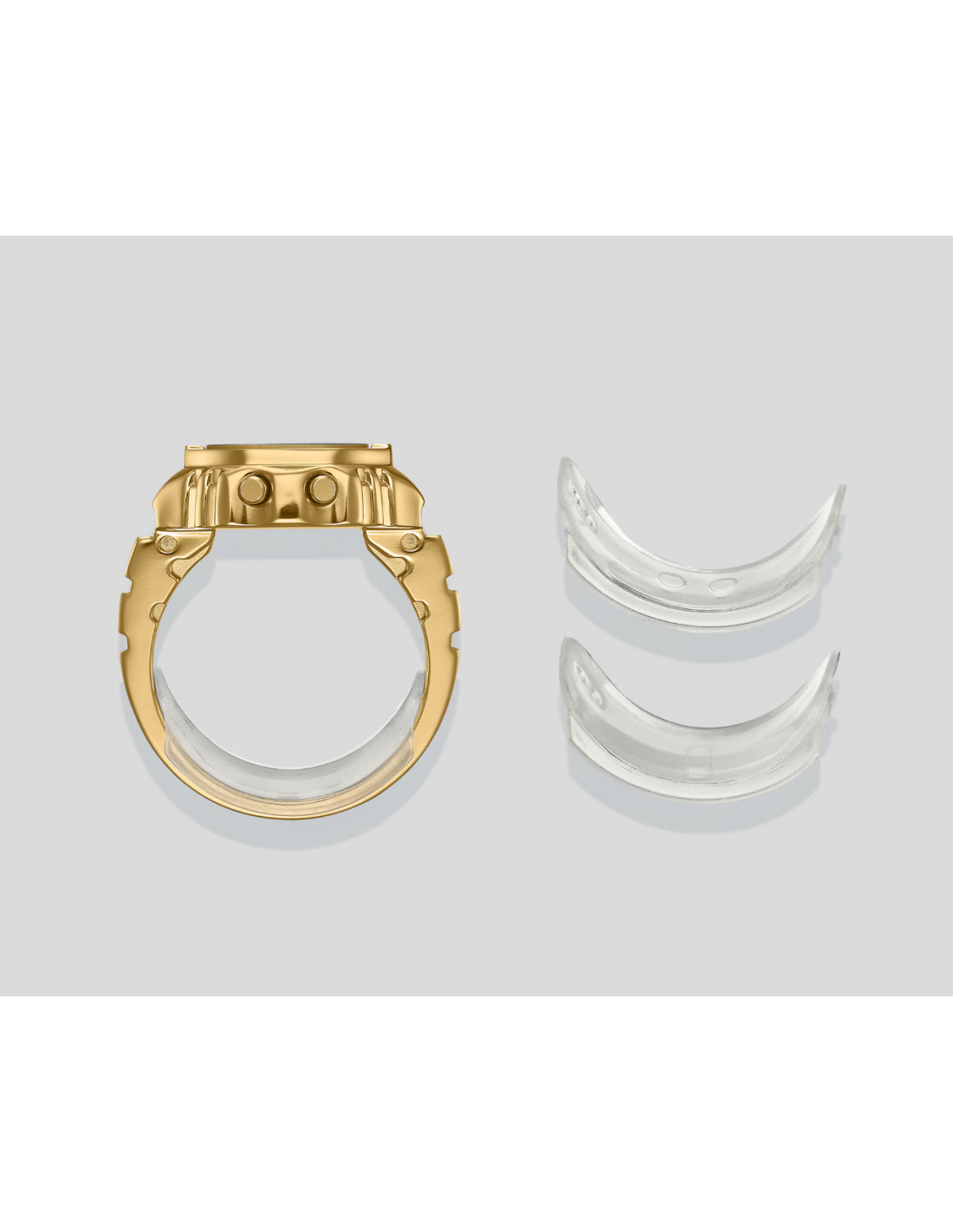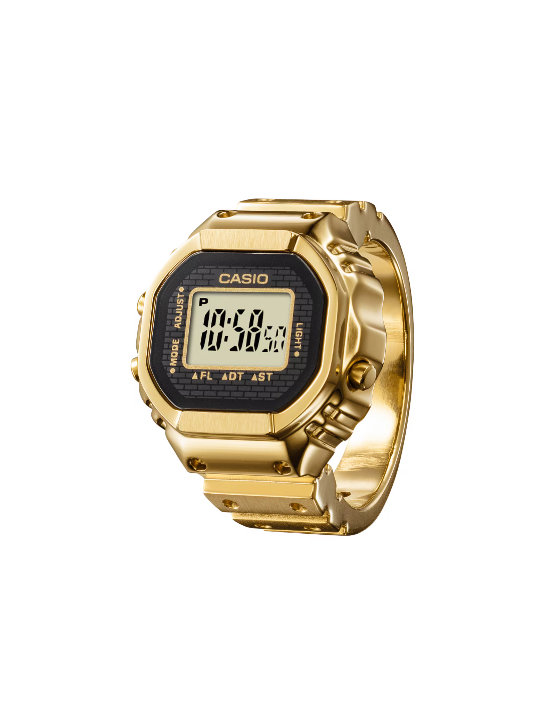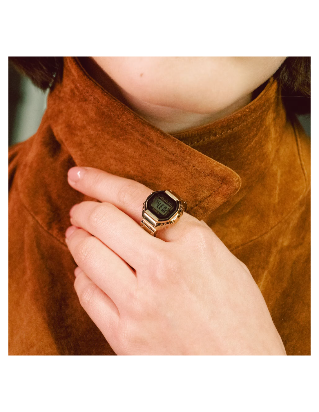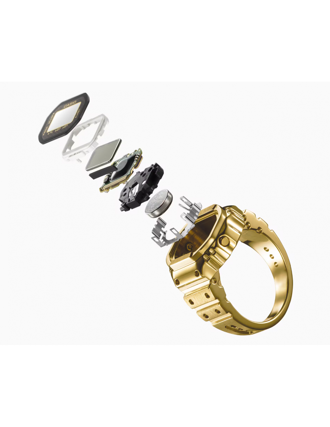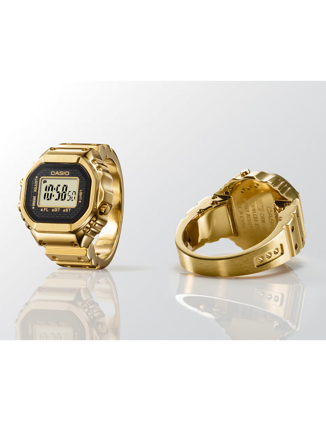 n reloj de pulsera digital para el dedo: práctico y divertido. Diseño compacto, aspecto sofisticado y un toque de pura diversión. Crear una versión de tamaño anillo de la compleja forma y funciones del reloj Casio no fue tarea fácil. Para que esto fuera posible, necesitábamos utilizar el avanzado moldeo por inyección de metal (MIM) para recrear con precisión los detalles más finos en acero inoxidable. El anillo se termina con un baño de iones de color dorado que le da un brillo resplandeciente. La carcasa monocasco y la técnica especial de pegado del cristal garantizan un sellado hermético para la resistencia diaria al agua, al tiempo que permiten sustituir la batería. Hemos multiplicado por 10 el tamaño del módulo de reloj estándar y lo hemos combinado con una pequeña pila de botón para crear un reloj digital de 3 botones totalmente funcional que realmente cabe en el dedo. Incluso con este pequeño tamaño, el reloj cuenta con una pantalla LCD de 7 segmentos que muestra toda la información que necesita: horas, minutos y segundos, así como fecha, hora dual y cronómetro. Una suave luz intermitente se activa a la hora elegida, ofreciendo un brillo sutil y emotivo. El anillo se ajusta a un dedo de la talla 22 (US 10.5, EU U) y viene con dos espaciadores de ajuste de talla, en talla 19 (19 mm de diámetro interior) y talla 16 (18 mm de diámetro interior).