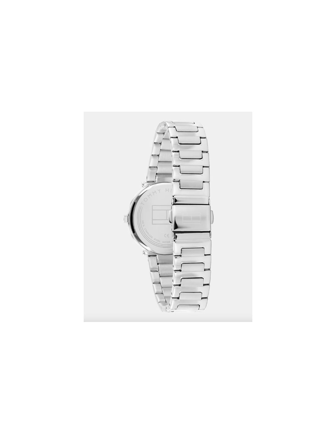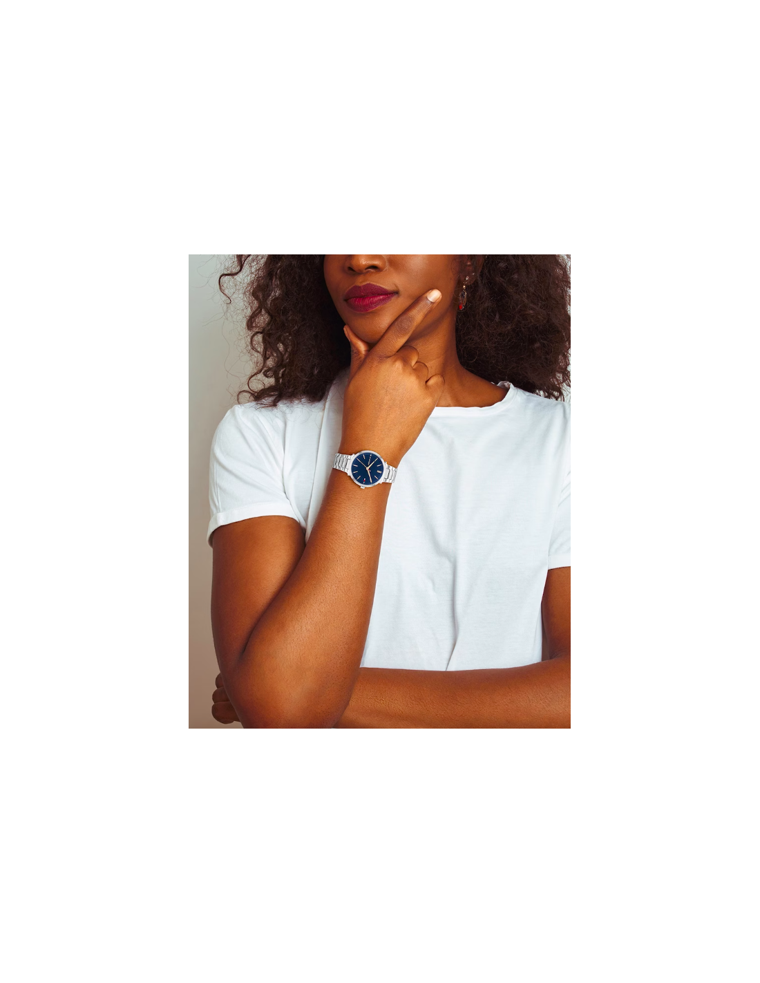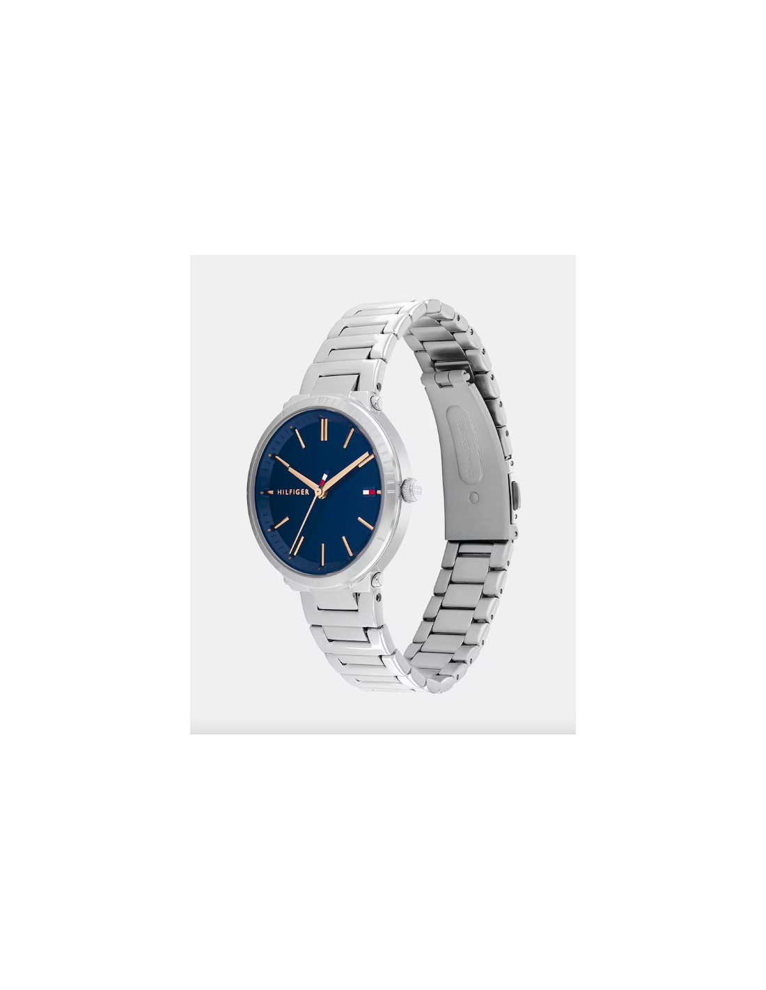 Reloj de tres agujas con caja de acero inoxidable, esfera en color azul tornasolada con indicadores y brazalete de eslabones en acero inoxidable.